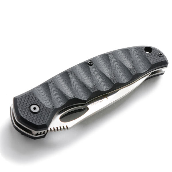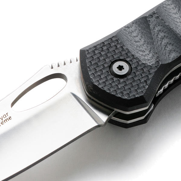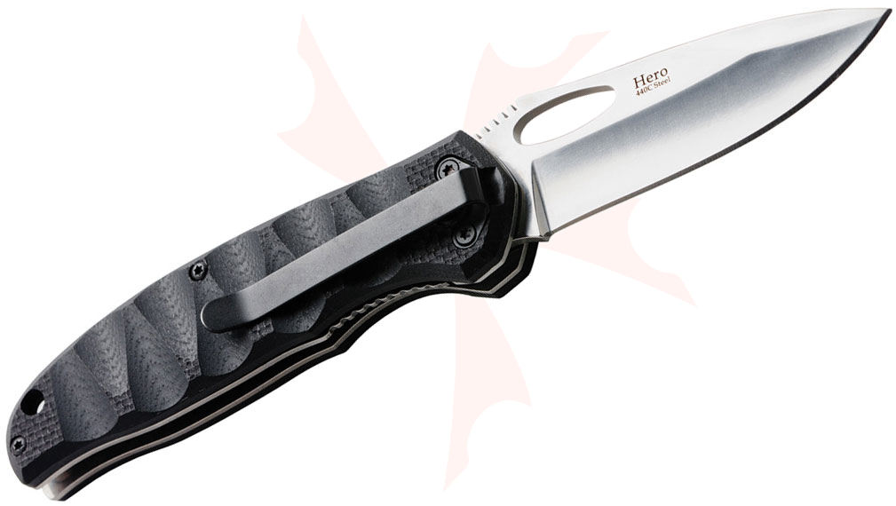 It has a tight, deep carry pocket clip that can be used to carry the knife on a pocket or a belt. Instead of the standard thumbstud Hero has an "eye" that is used for opening the folder. Many people find this to be a better and more reliable way to open a folding knife, and we think it looks pretty slick as well.