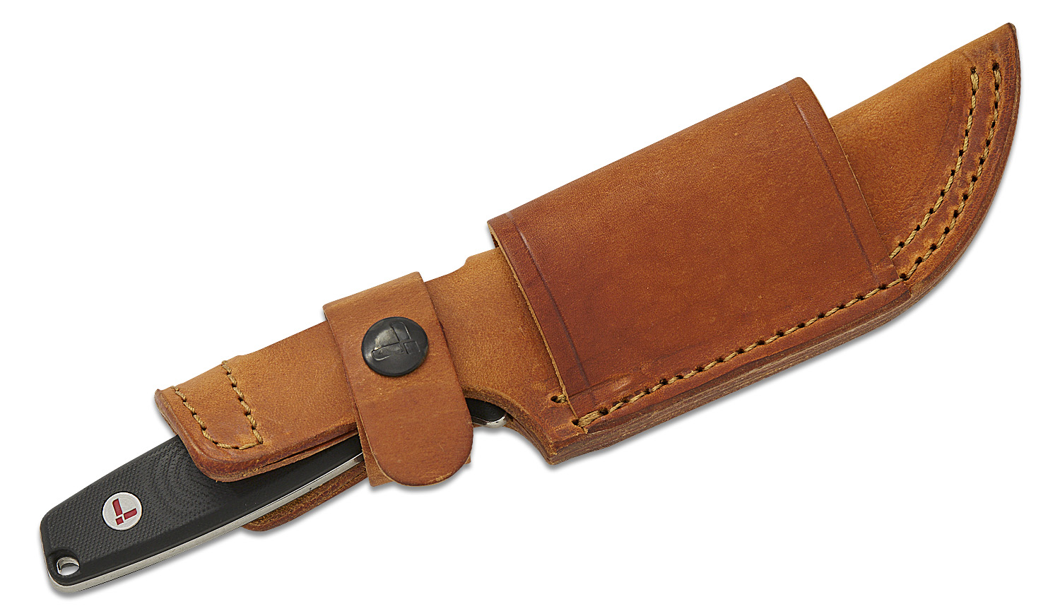 Leatherman USA Made Trac Fixed Blade Knife 4.2" CPM-MagnaCut Stonewashed Drop Point Blade, Jet Black G10 Handles, Brown Leather Sheath - 833405