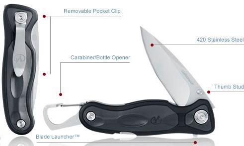 A classic locking liner with Leatherman's Blade Launcher knife deployment mechanism. Durable glass-reinforced nylon handles provide a sure grip for working with the 420 stainless steel blade. Available with a plain (model e300) or combo edge (model e301).