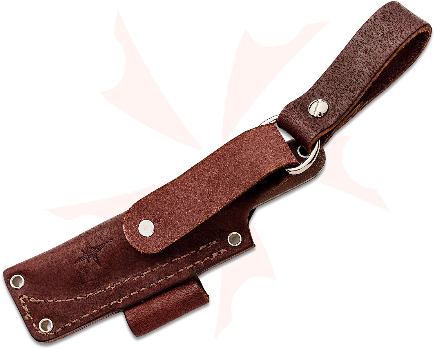 The knife would not be complete without a sheath, and the included JRE Industries leather sheath makes it easy to carry the Bushcrafter HC. Retention is good, and there is a ⅜" diameter leather loop on the side to facilitate easy carry of a firesteel. Additional rivets allow versatile lashing options. The sheath can be used with the included dangler attachment for drop-leg carry. If you prefer your knife to carry higher on the belt, you can remove the dangler, or simply fold it underneath and out of the way.