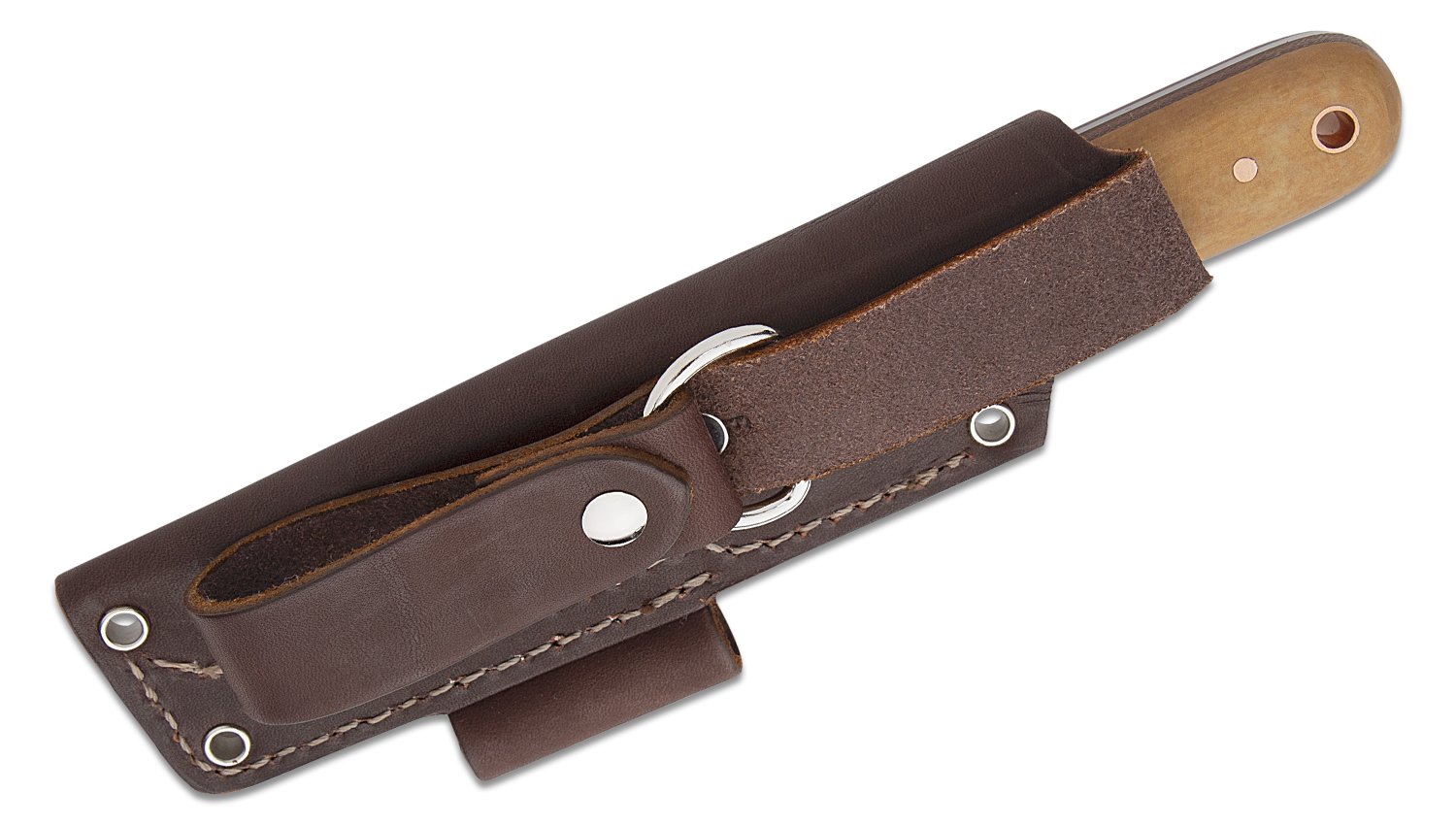 The knife would not be complete without a sheath, and the included JRE Industries leather sheath makes it easy to carry the Bushcrafter. Retention is good, and there is a 3/8" diameter leather loop on the side to facilitate easy carry of a fire steel. Additional rivets allow versatile lashing options. The sheath can be used with the included dangler attachment for drop-leg carry. If you prefer your knife to carry higher on the belt, you can remove the dangler, or simply fold it underneath and out of the way.