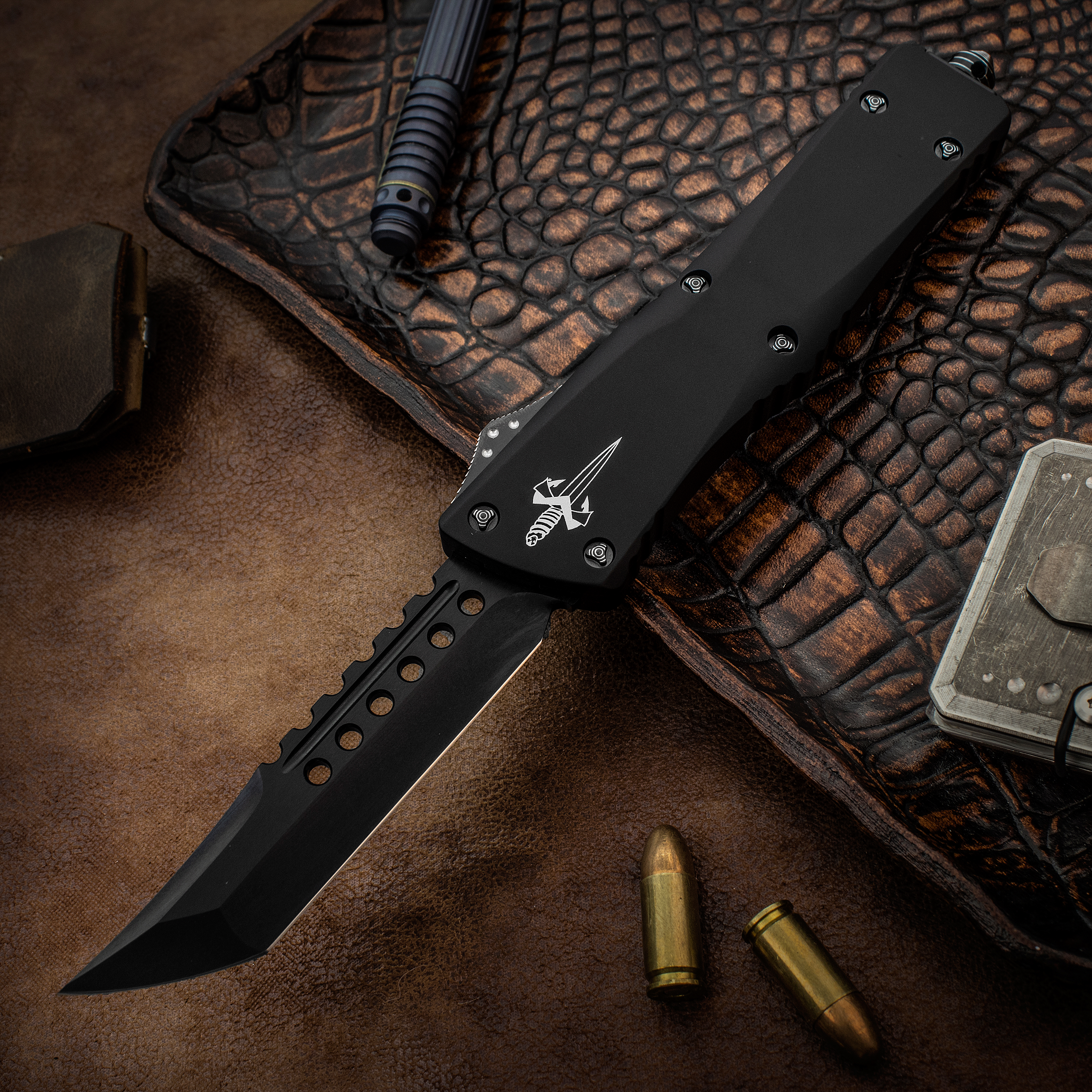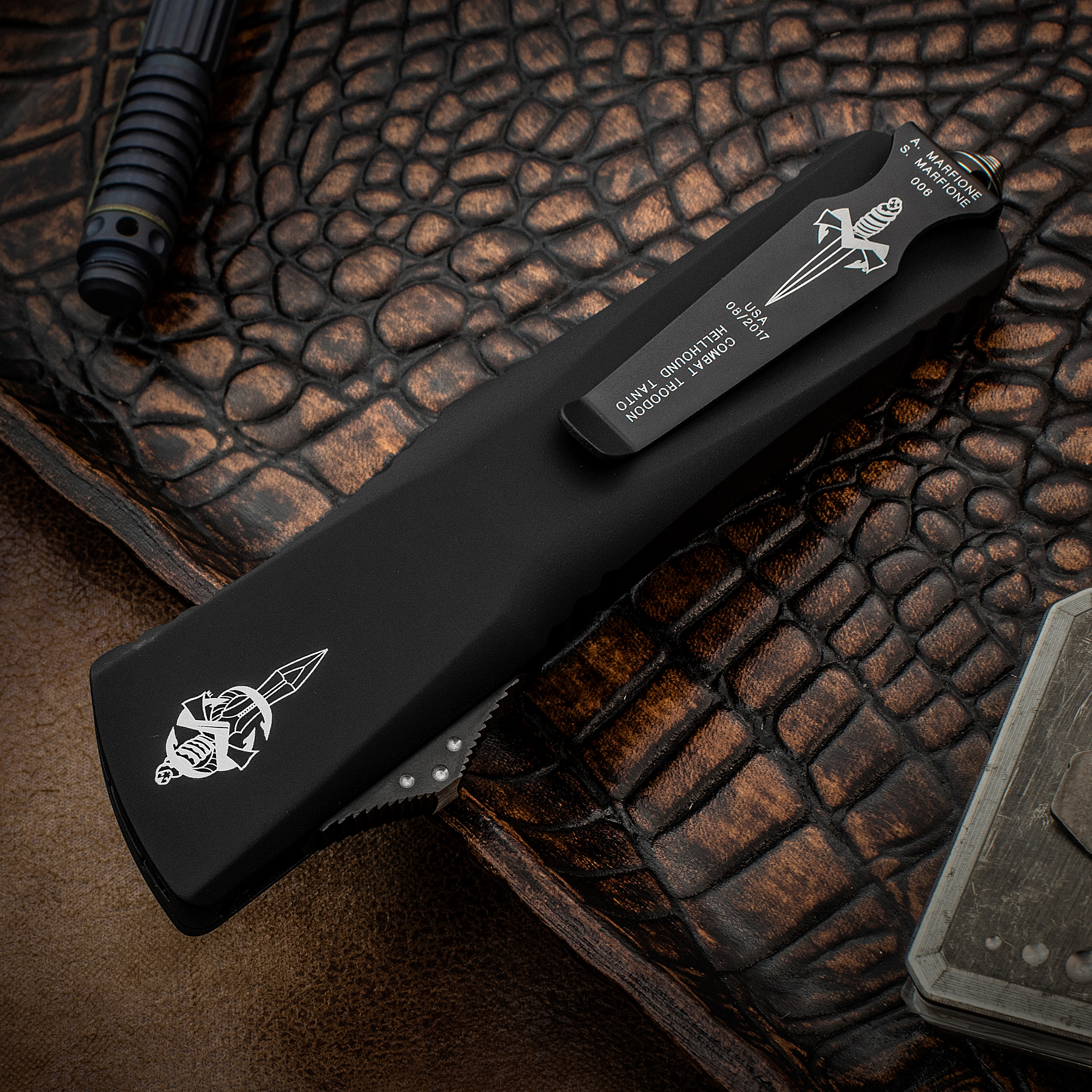 Marfione Custom Knives Combat Troodon OTF AUTO 3.875" Black DLC M390 Hellhound Tanto Blade, Black Aluminum Handles, Ringed DLC Hardware