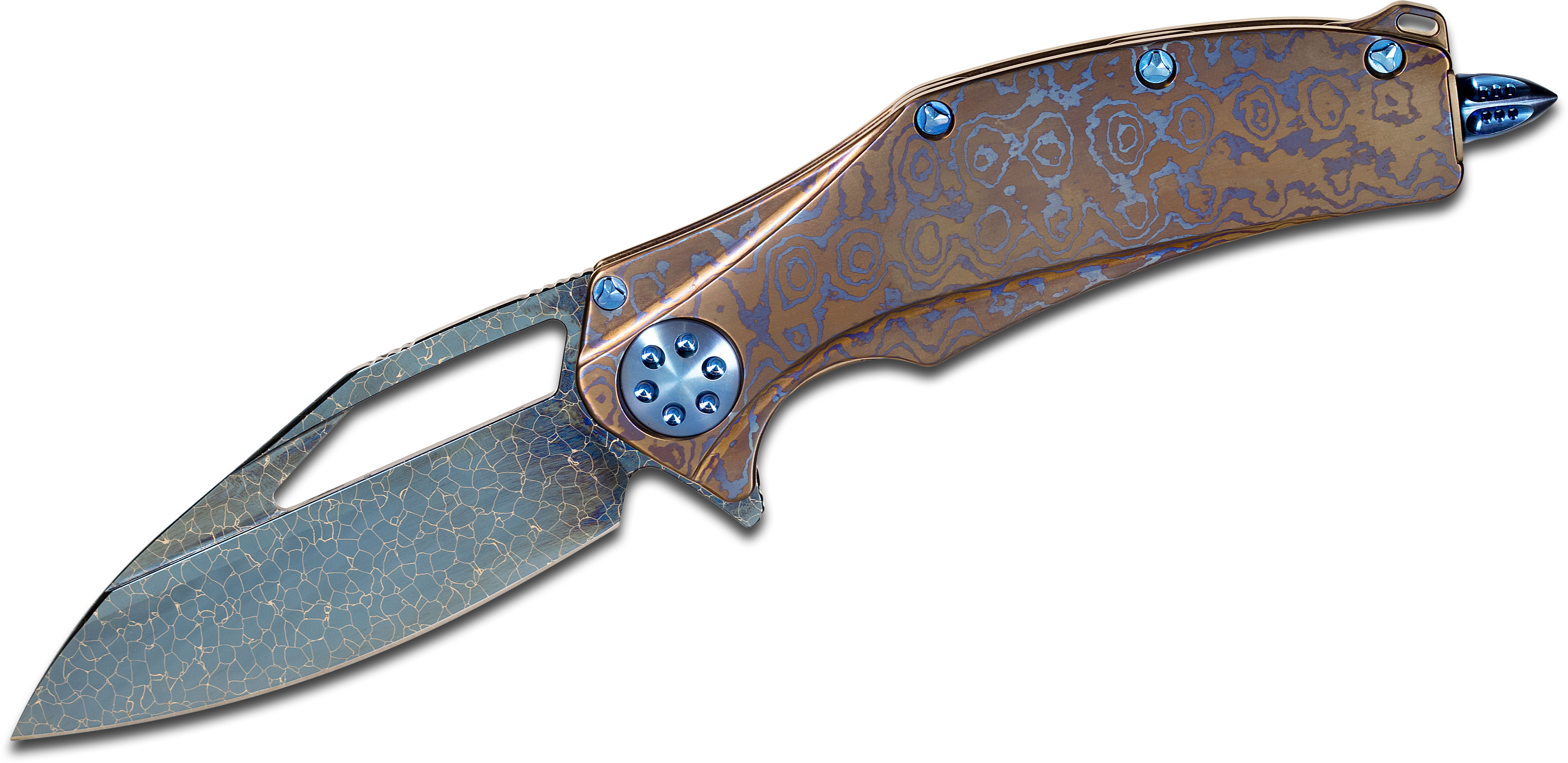 The size is ideal if you prefer a larger, high-end EDC blade that can easily flex into a tactical role as well. The handle is beautifully machined Chad Nichols mokuti with a full mokuti frame lock mechanism overlaid with a Damascus plate. It comes with blue anodized titanium hardware, a glass breaker on the butt end, and an intricately milled mokuti backspacer with a small lanyard hole. The B. Rietveld Nebula Damascus blade has a blued finish to match the handle accents and gives you the option to use the flipper mechanism or blood groove to open the blade. It is a knife you will want to carry each and every day and is sure to become a collection favorite in no time. Includes a metal certificate of authenticity, serial number, and manufacture date of 11/2016 on the pocket clip.
