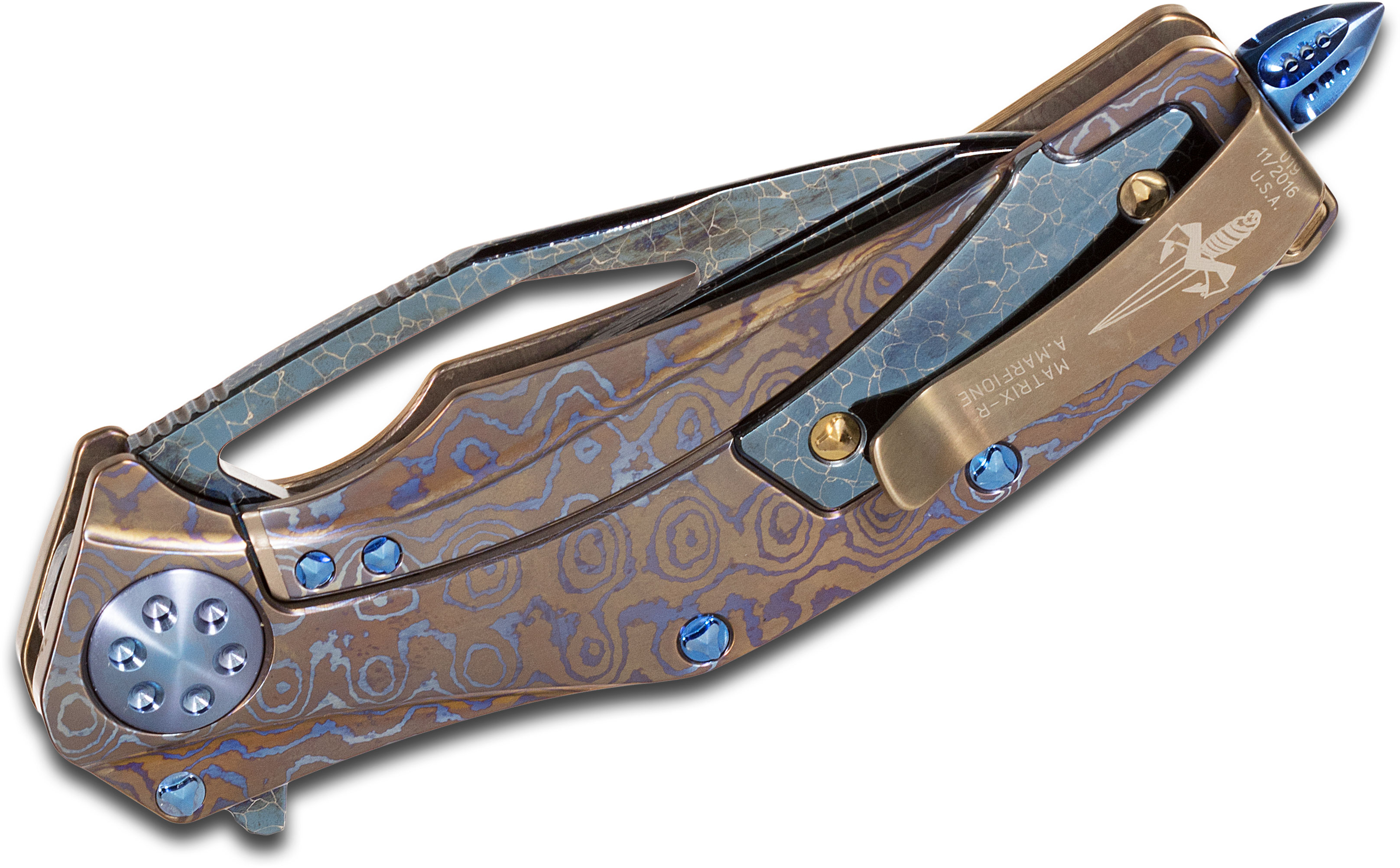 Marfione Custom Knives Matrix R Flipper 3.75" Blue Nebula Damascus Blade, Nichols Mokuti Handles, Nylon Pouch, Frame Lock