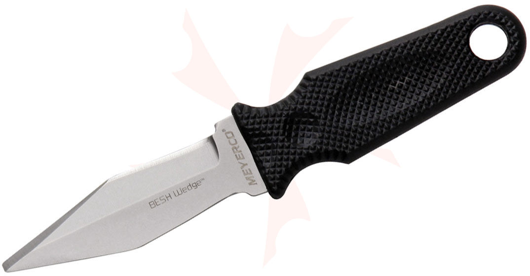 The BESH Wedge neck knife features the special Besh Wedge design, developed by the Canadian knifemaker Brent Beshara, which combines an extraordinary tip strength with maximum penetration capability. The blade is made from 440 stainless steel, with a glass-filled nylon handle, and friction fit plastic sheath. The package measures 6" overall, with a 2.875" blade, and weighs less than three ounces.