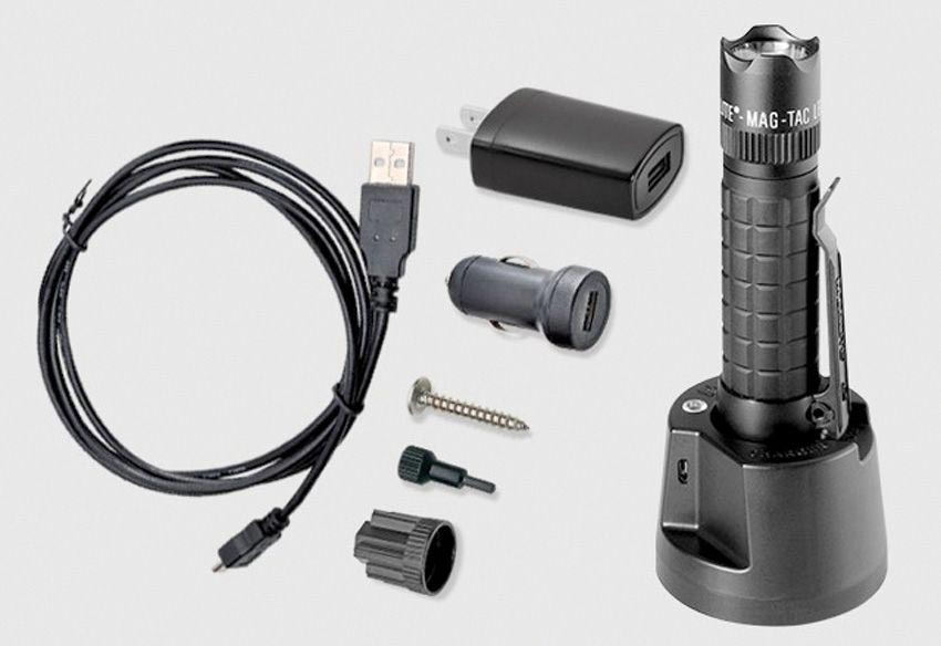 This Maglite Mag-Tac LED Flashlight is an advanced lighting tool powered by a high-capacity Lithium Iron Phosphate (LiFePO4) rechargeable battery engineered for long service life with a 1-18 hr. run time. Along with superior build quality and performance, this crowned-bezel version of the MAG-TAC LED rechargeable flashlight comes with a detachable pocket clip and a USB-powered mountable charging base.