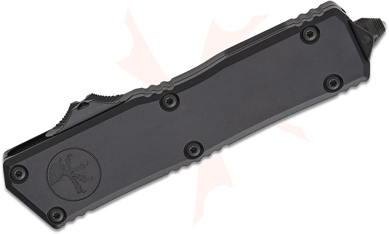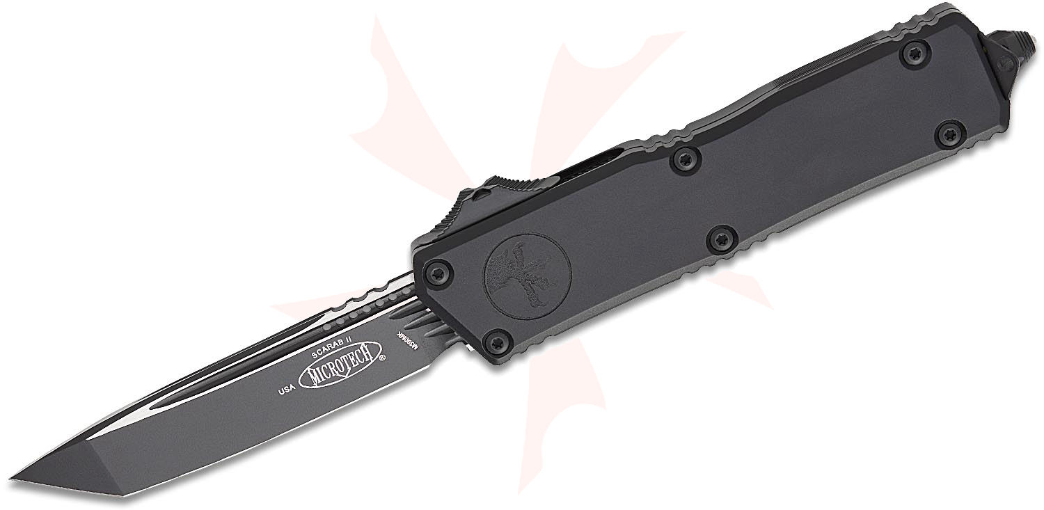 The Microtech Scarab II is a high-quality tactical out-the-front knife, based on the original Microtech Ultratech design. Built to withstand the extreme, the Scarab II excels in high-intensity covert operations. The Scarab II is designed for a broad spectrum of utility and close-quarter combat applications for use by qualified law enforcement, military, and government agency operatives. The Scarab II is fabricated to the highest possible standards to assure reliability and safety with its use. Featuring a one-handed, open and close, dual-action out-the-front (OTF) design, and a nearly four-inch blade, the Scarab Executive does away with non-slip grip inlays on both sides for a cleaner look.