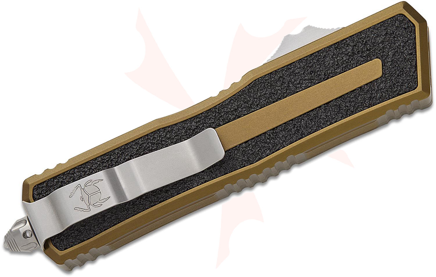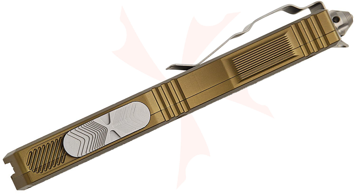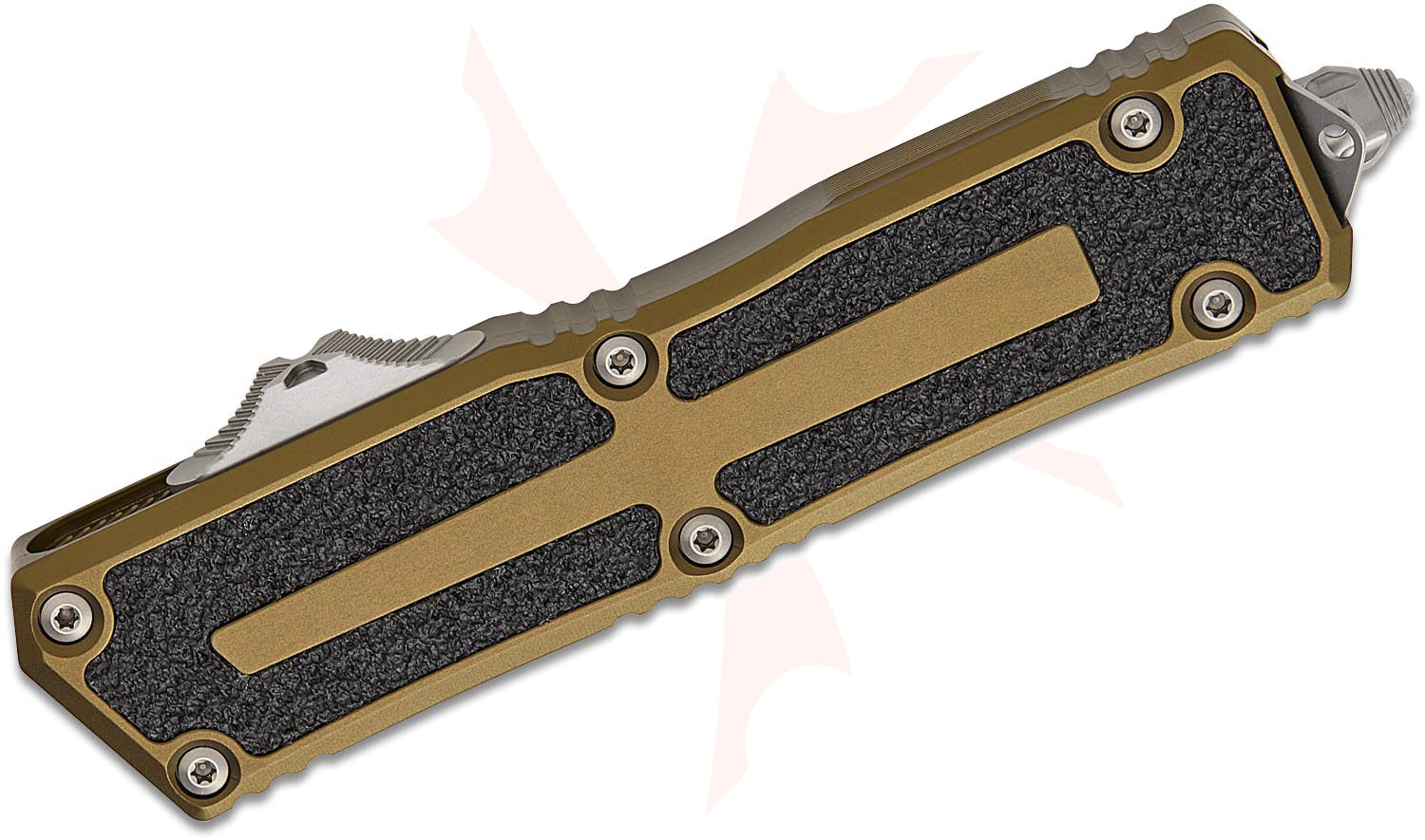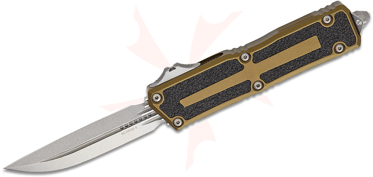 The Microtech Scarab II is a high-quality tactical out-the-front knife, based on the original Microtech Ultratech design. Built to withstand the extreme, the Scarab II excels in high-intensity covert operations. The Scarab II is designed for a broad spectrum of utility and close-quarter combat applications for use by qualified law enforcement, military, and government agency operatives. The Scarab II is fabricated to the highest possible standards to ensure reliability and safety with its use. Featuring a one-handed, open and close, dual-action out-the-front (OTF) design, and a nearly four-inch blade, the Scarab is produced with a large, easy-to-grip handle that contains non-slip grip inlays on both sides.