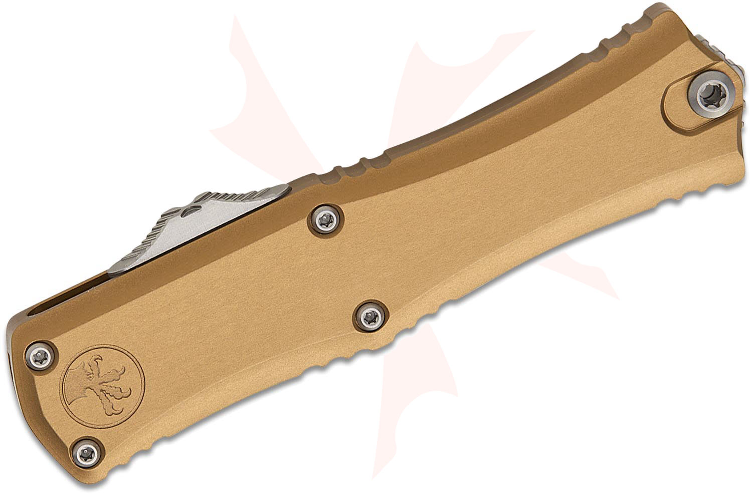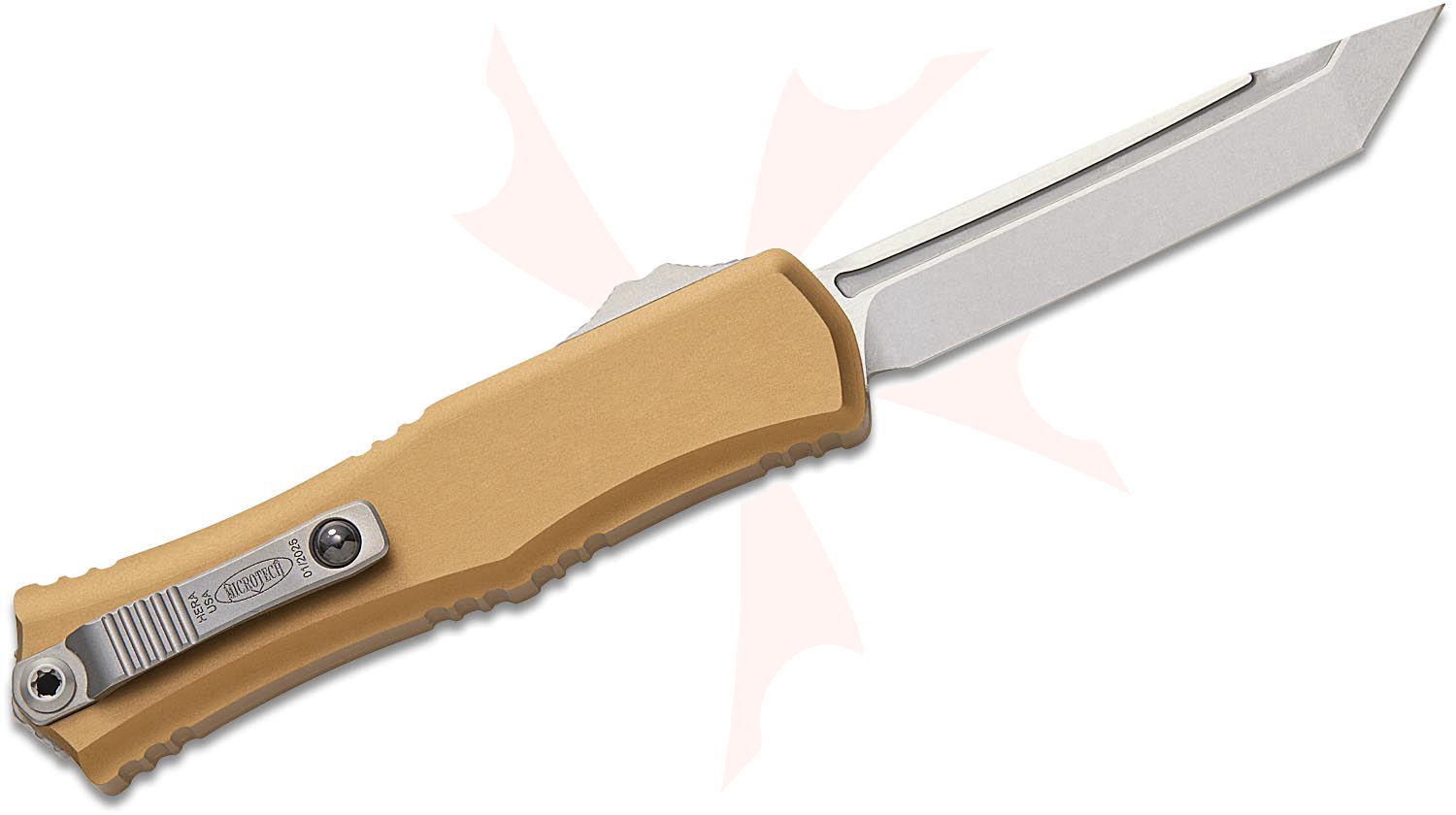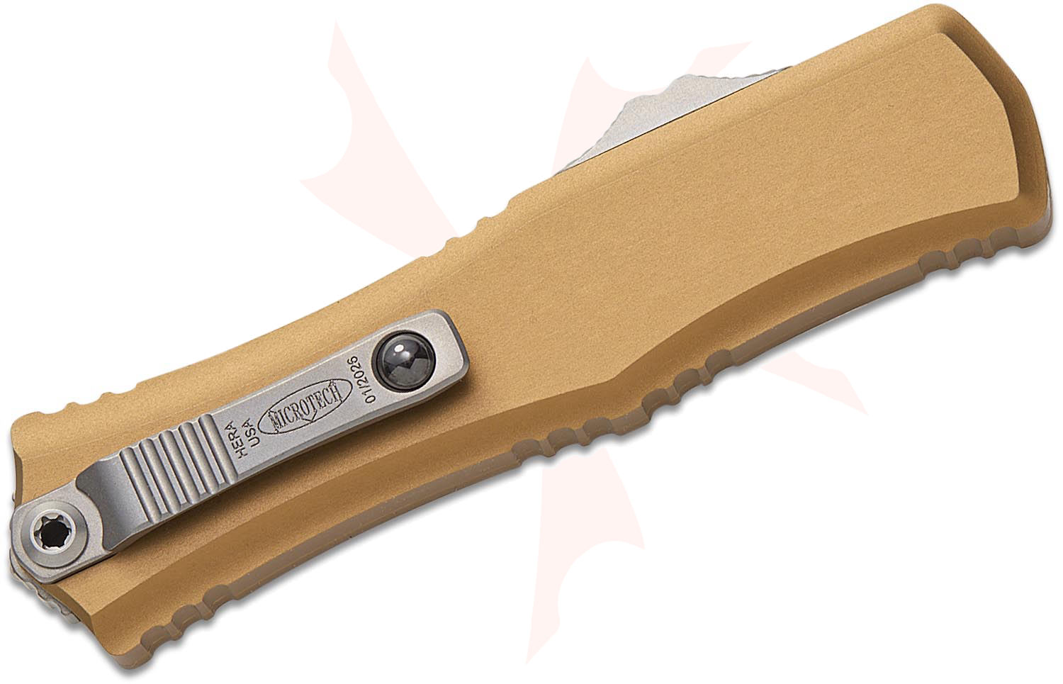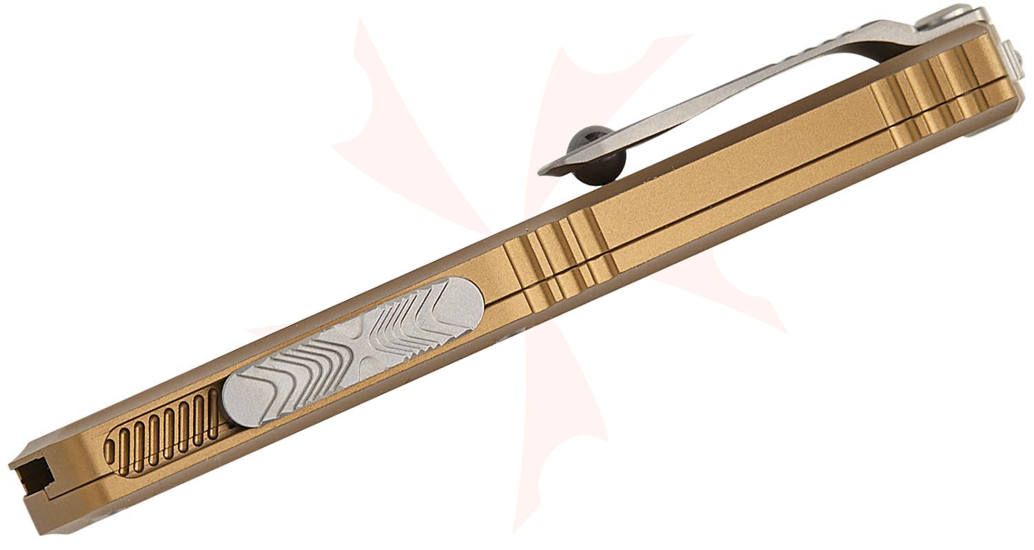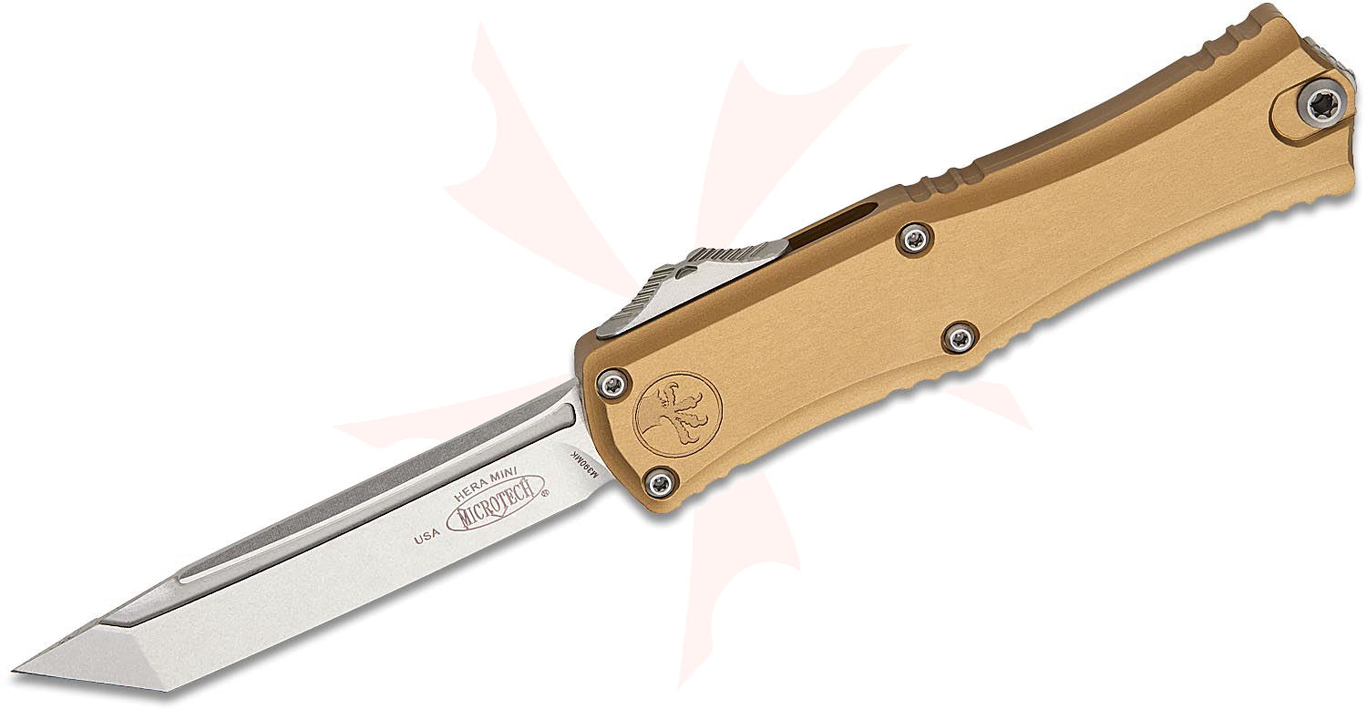 Microtech 1704M-10TA Hera II Mini OTF AUTO Knife 3" M390MK Stonewashed Tanto Plain Blade, Tan Deep Engraved Aluminum Handles