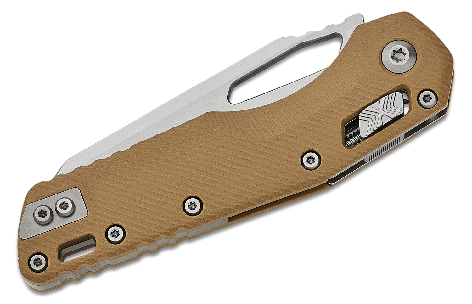 Microtech 210-10FLGTTA MSI RAM-LOK Manual Folding Knife 3.88" Bohler M390MK Stonewashed Modified Sheepsfoot Plain Blade, Fluted Tan G10 Handles, AXIS/Crossbar Lock