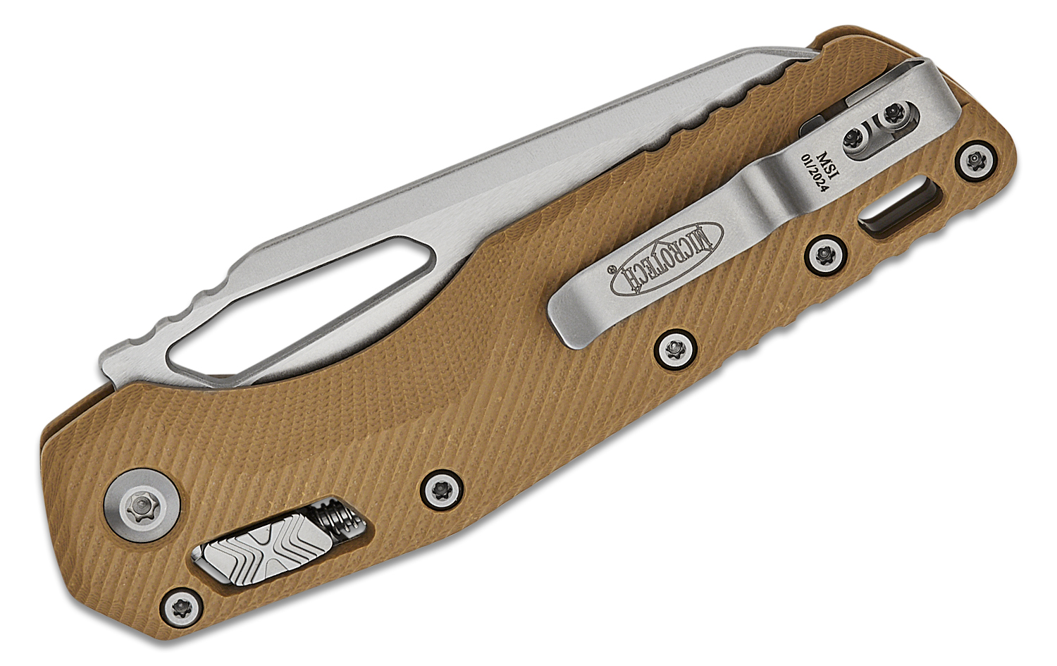 Released in 2023, the MSI (Microtech Standard issue) is Microtech's first knife to feature its fantastic RAM-LOK technology. This tough take on the crossbar lock features Microtech's signature step pattern made famous by the actuation switches on the Ultratech series. The large blade cutout gives ample room for reverse middle finger flicks as well as standard slow-roll thumb opening with or without gloves. If neither of those is your preference, then simply pull down on the RAM-LOK and the blade flies open with a simple wrist flick. The G10 handles are smooth and slightly tacky, providing great grip potential in both standard and reverse grips. Rugged, durable, and made in the USA; we know that the MSI is going to quickly become a fan favorite among all members of the knife community.