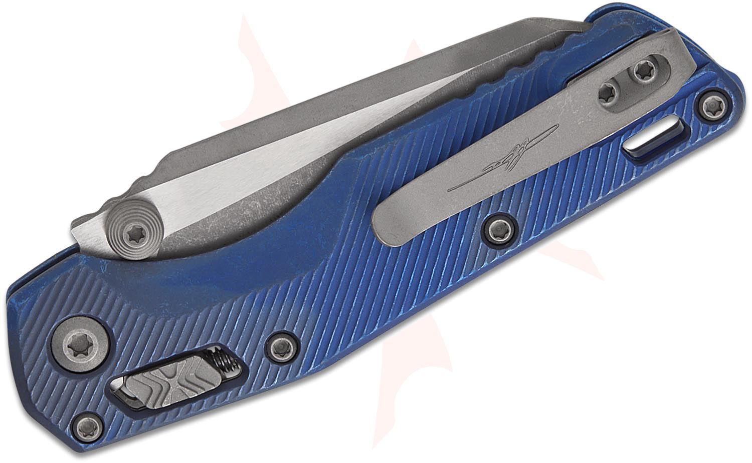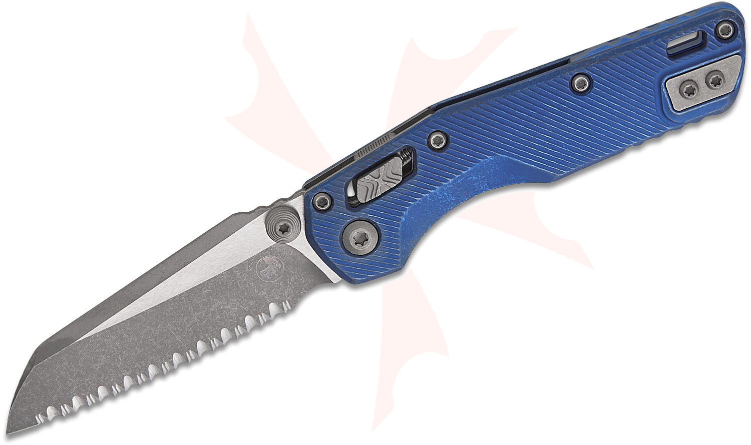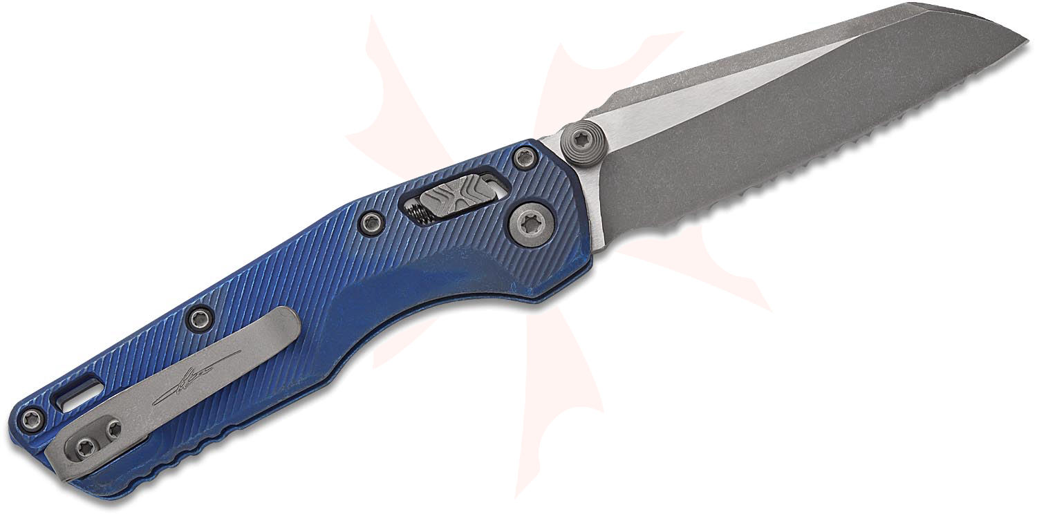 Microtech 210M-12APFLMS2 Marfione Select MSI Mini RAM-LOK Manual Folding Knife 3.19" Bohler M390MK Apocalyptic Modified Sheepsfoot Serrated Blade, Antique Blue Fluted Titanium Handles, Reversible Deep Carry Clip, AXIS/Crossbar Lock