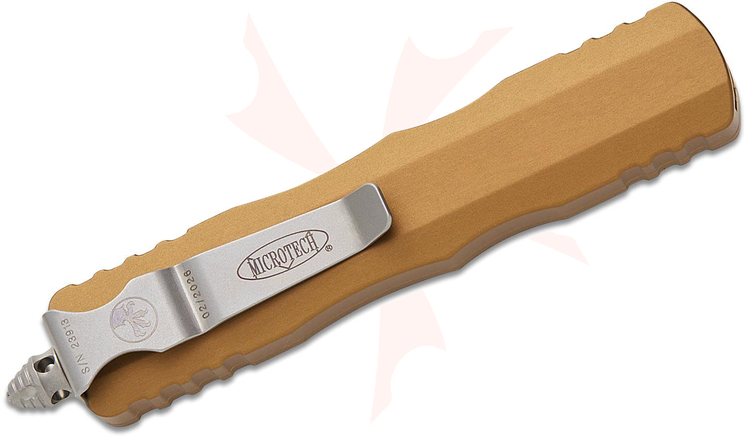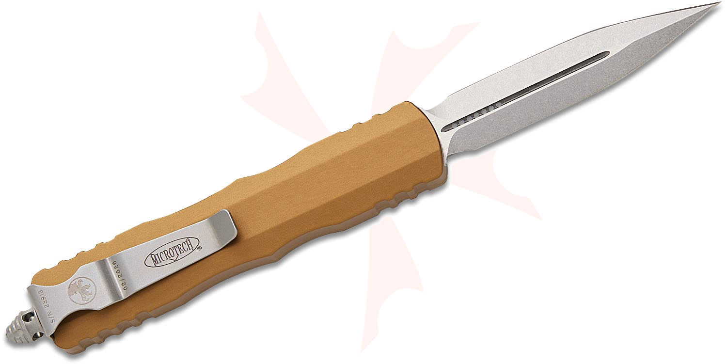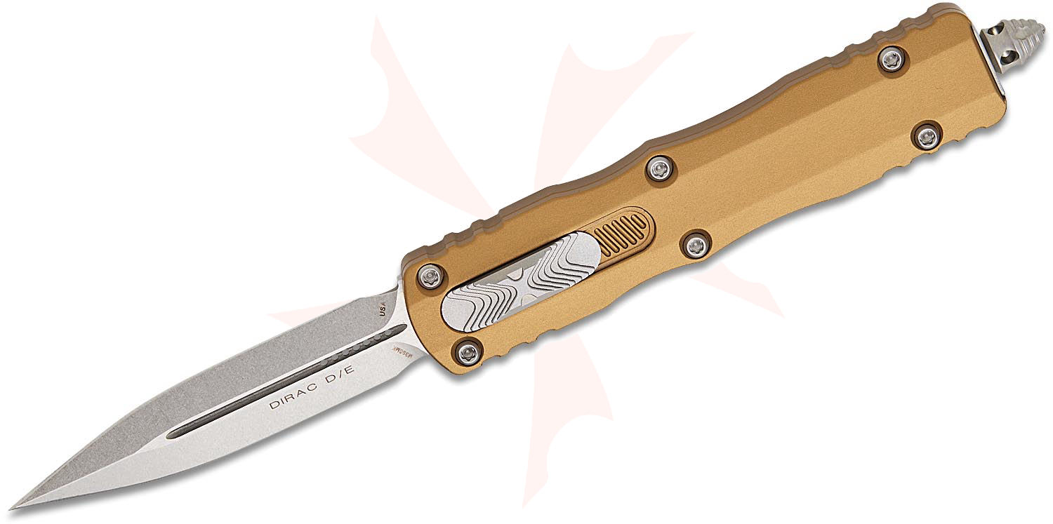Microtech 225-10TA Dirac AUTO OTF Knife 2.92" Stonewashed Double Edge Dagger Blade, Tan Aluminum Handles