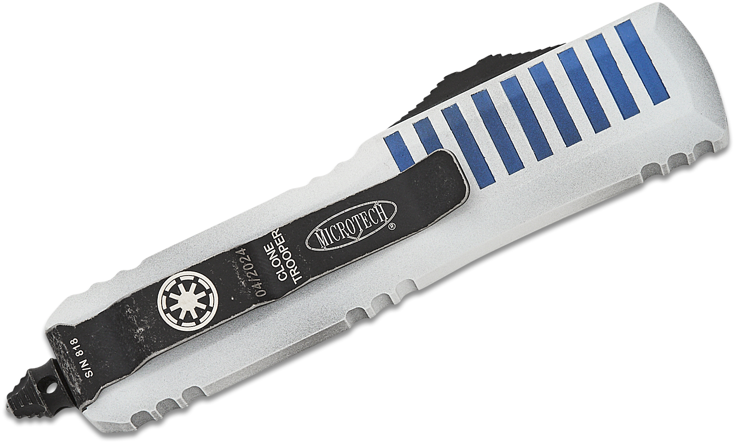 The Microtech UTX-85 OTF knife is the perfect combination of compact size and big performance. At 85% the size of the Ultratech, the Microtech UTX-85 is manufactured with the same materials, on the same machines, and with the same ingenuity as its predecessor. The Microtech UTX-85 is the perfect knife for all situations--no matter what your cutting task; it will mesh seamlessly with your lifestyle. With its quick one-handed open and close action, it gets the job done in seconds. Equipped with an ambidextrous pocket clip and compact size, this is the perfect choice for everyday use and carry. This model features a white finished blade and handle with blue trim, dubbing it the Clone Trooper. It also features a very cool Clone Trooper emblem on the handle and the pocket clip which is the eight-spoked symbol of the Grand Army of the Republic (Clone Army).
