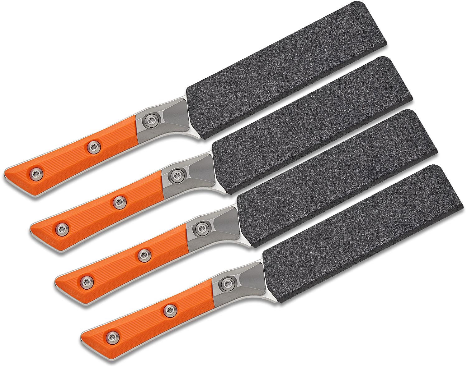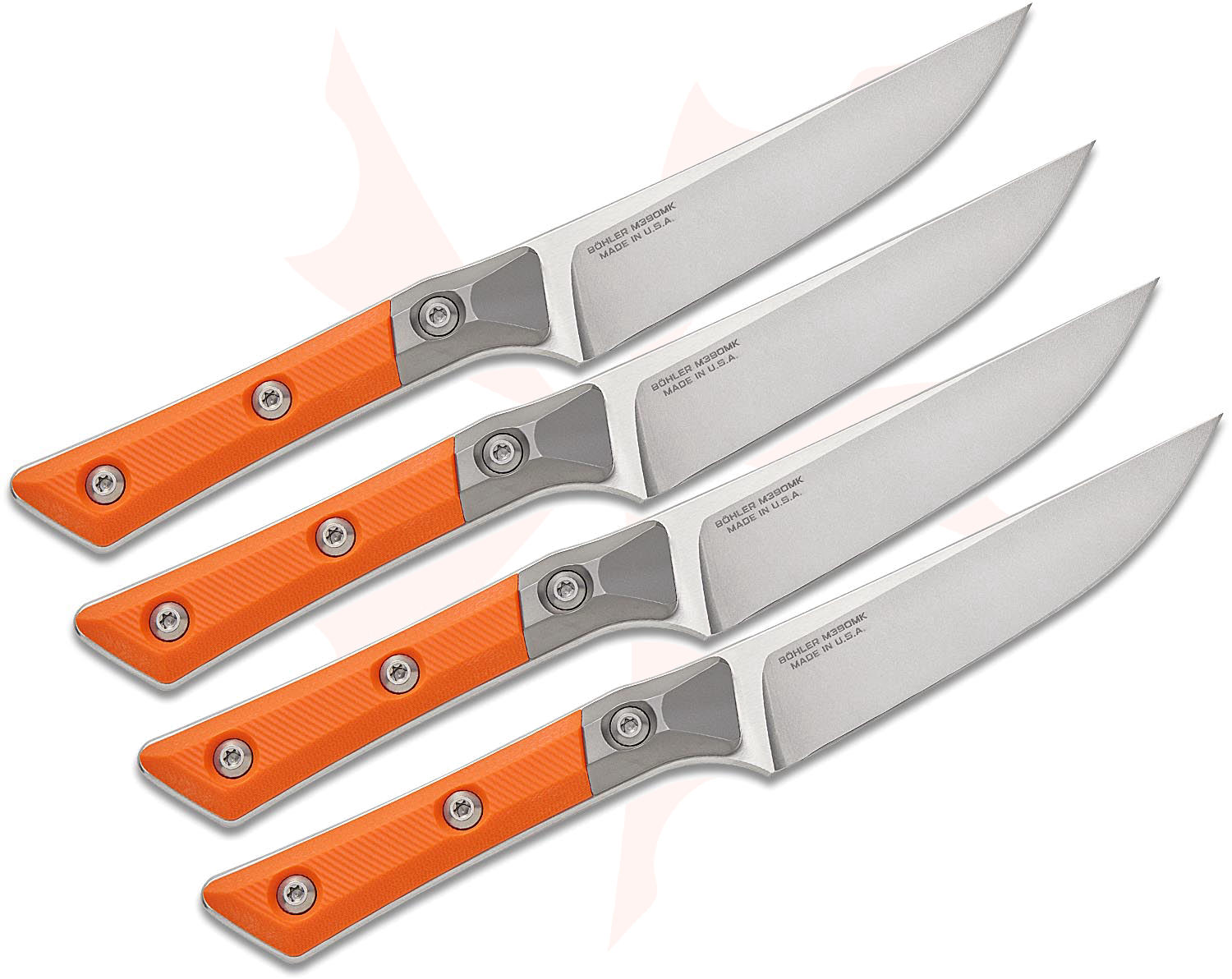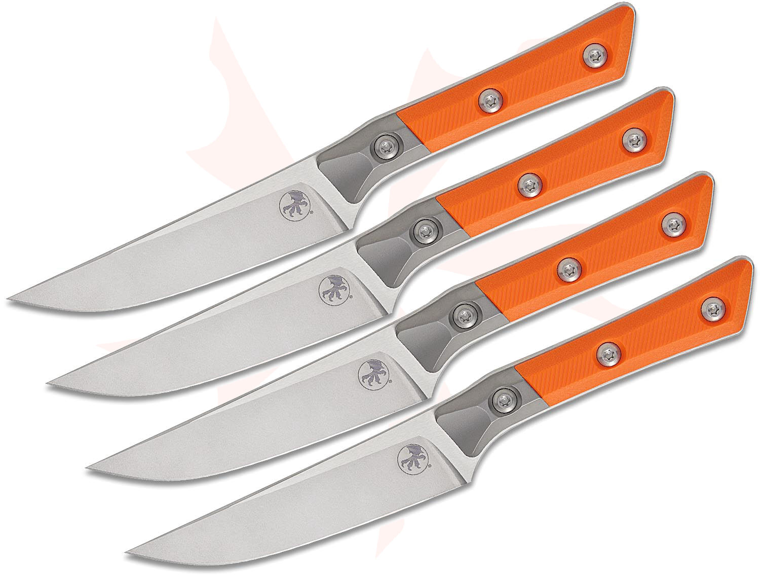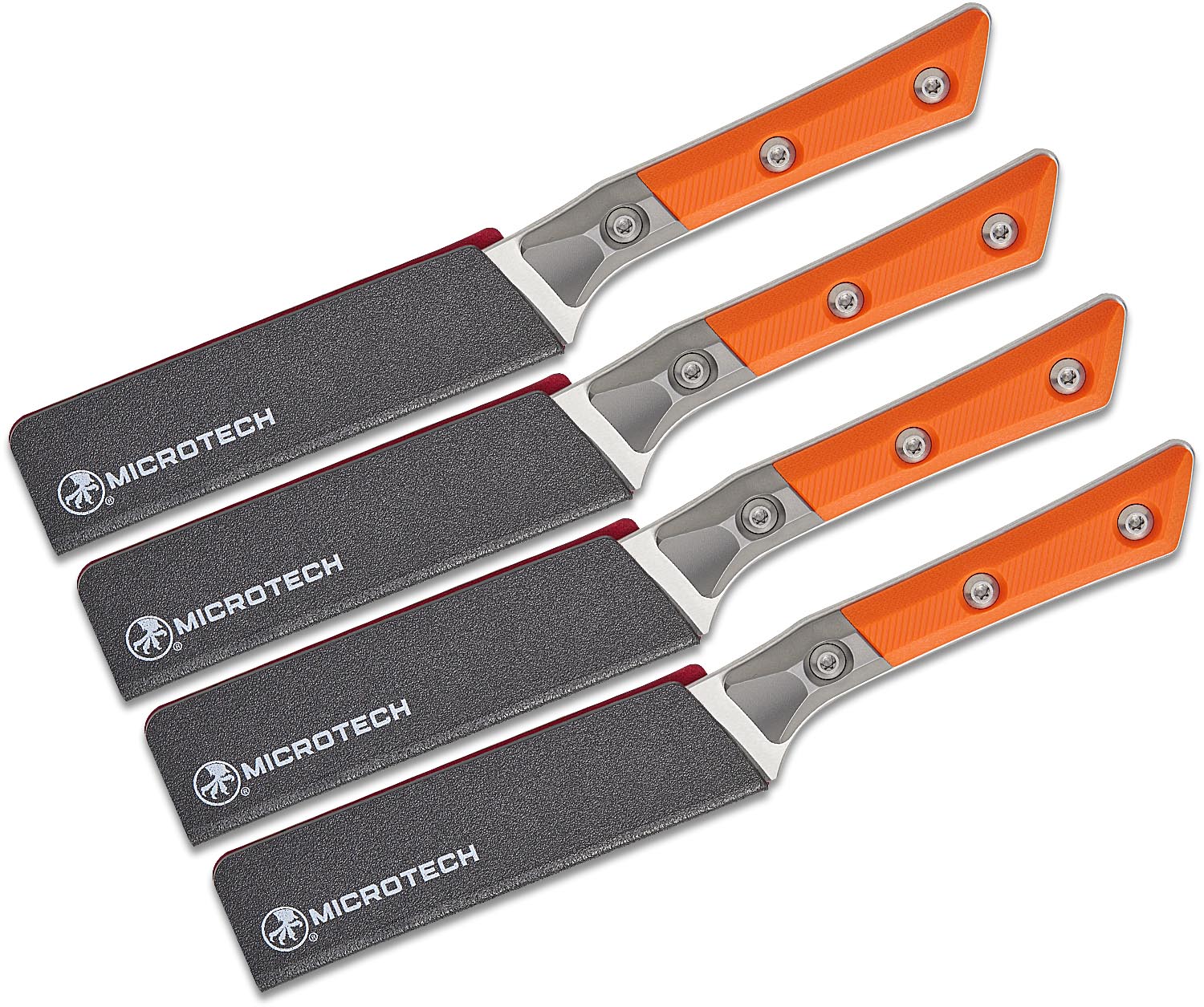 Microtech 3600B-10SETEM Kitchen 4-Piece Steak Knife Set, 4.5" M390MK Stonewashed Plain Blades, Ember Orange G10 Handles with Bead Blast Titanium Bolsters