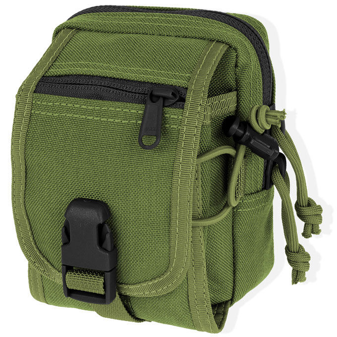 Compact versatile waistpack. The M-1 Waistpack (#0307) is Maxpedition's flagship low-profile waistpack, compact and versatile, perfect for carrying small personal essentials close to the body. Some like to use this pocket for a small first aid kit. The main compartment is accessed through a YKK #10 zipper top with 550 paracord pulls. The frontal compartment expands greatly, contents retained by bungee cord, and secured with lid equipped with Velcro and quick release snap. The M-1 can be worn directly on a belt through an integrated belt loop or become a modular pocket compatible with ALICE or MOLLE type webbing using a pair of 3" TacTie (sold separately).