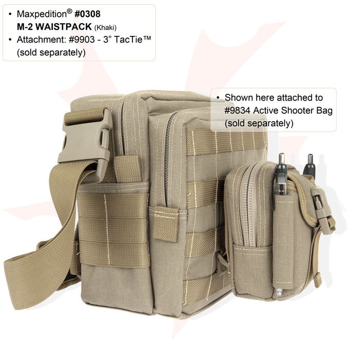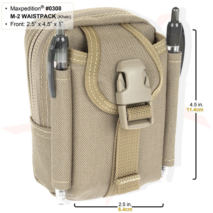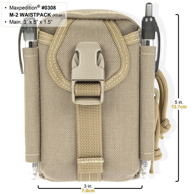 The M-2 Waistpack (#0308) is Maxpedition's smallest modular pocket, offering even lower profile than the best-selling M-1. The front snap compartment will fit a cellphone or flashlight while the main compartment, with three small pack cloth subdividers, is the right size for GPS, small radio, digital camera, or an 8 oz. soda can. Two pen slots hold writing utensils or sunglasses. The M-2 Waistpack can be used as a stand-alone belt pouch or can be integrated to ALICE or MOLLE type webbing using a pair of 3" TacTie (sold separately).