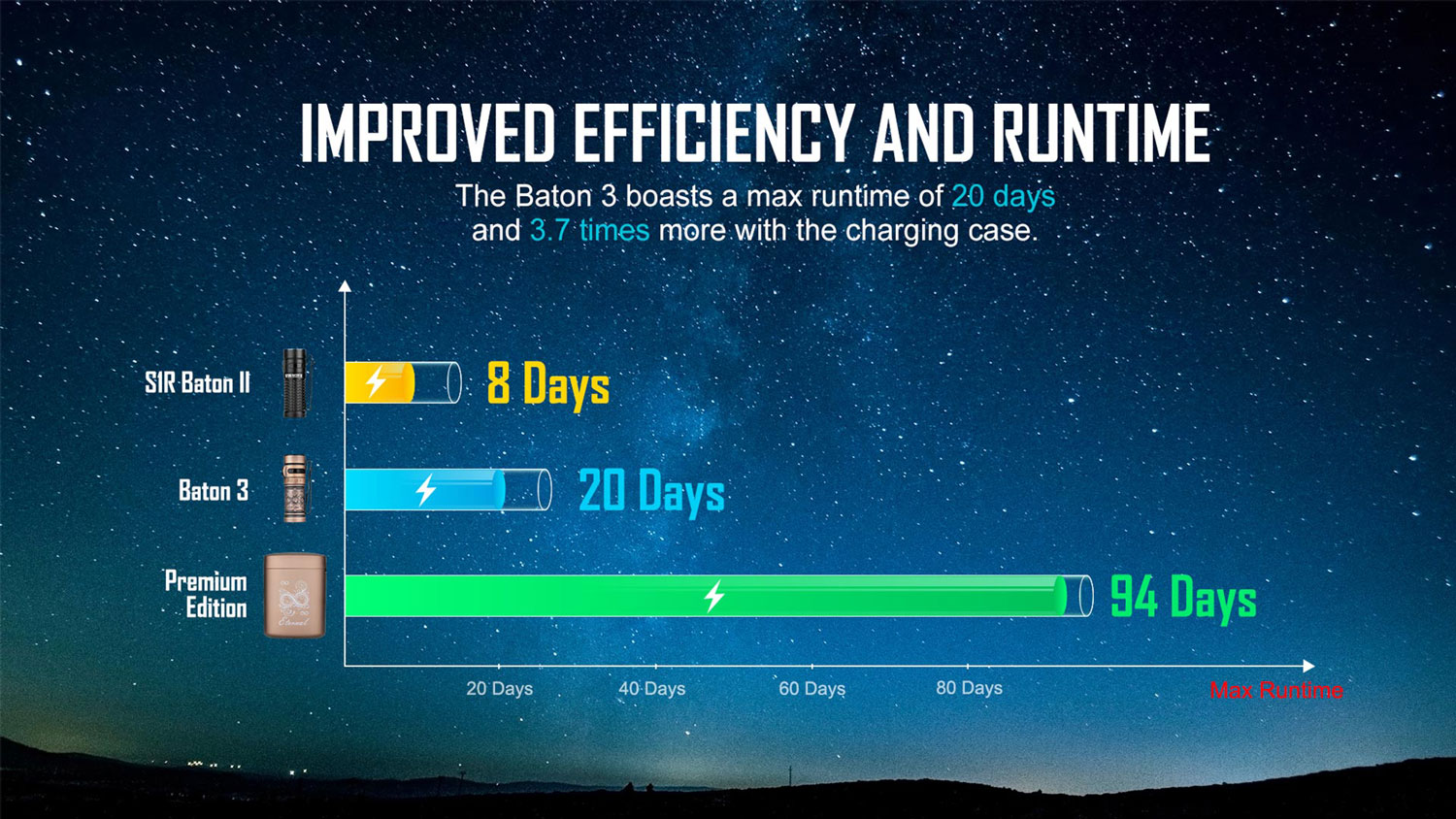 - Powered by a single customized IMR16340 battery, the Baton 3 boasts a max runtime of 20 days that you can always count on.