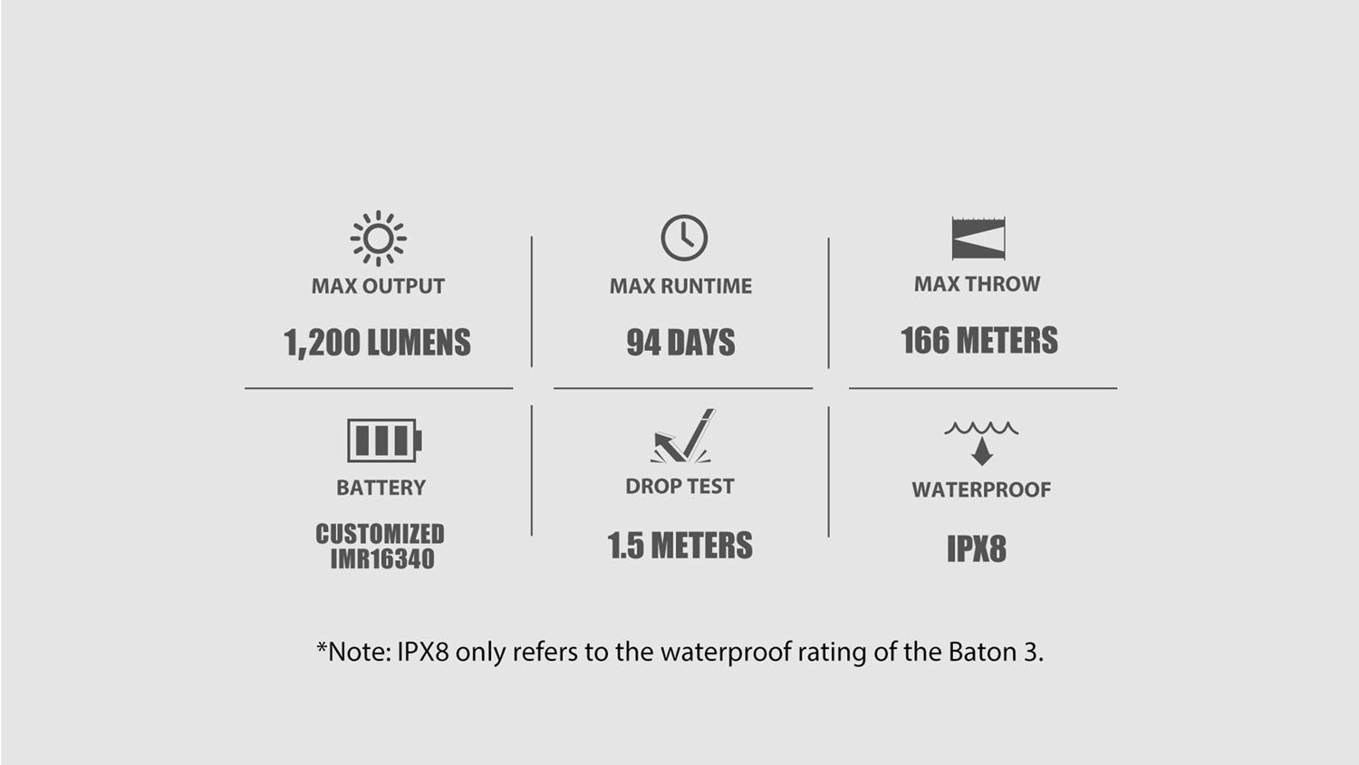 - With significantly improved performance, this tiny Baton 3 delivers a huge output of 1,200 lumens and a 166-meter beam distance.