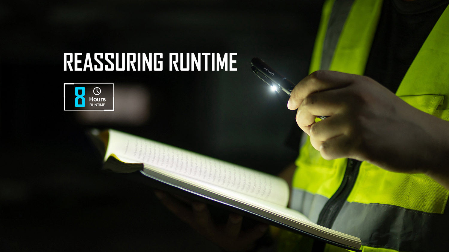 - With a built-in 110mAh rechargeable lithium-polymer battery, the light can run up to 8 hours and be fully charged in less than one hour.