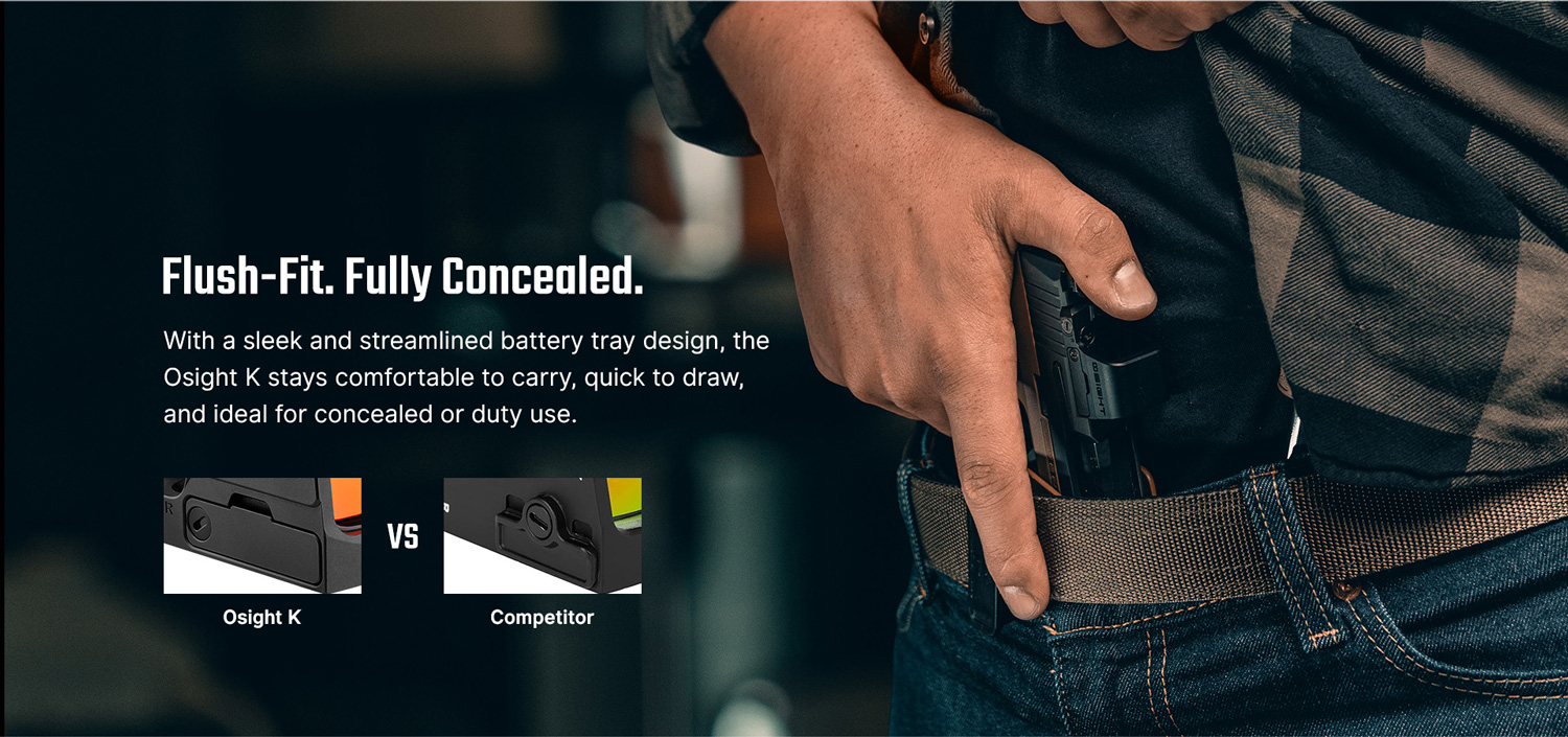 The Osight K is a convenient and streamlined weapon optic that runs off an easy-to-exchange CR1632 battery. The optic boasts a runtime of approximately 63,000 hours on a single battery. The convenient side load port allows for quick exchange of the battery while remaining unobtrusive. Made of durable aircraft-grade 7075 aluminum, the optic features a large window, 6 MOA dot, motion sensor function, light sensor technology, and an industry-standard footprint. Moreover, the optic is equipped with a low battery indicator that flashes 3 times every minute, so you can easily check the battery status and replace it.