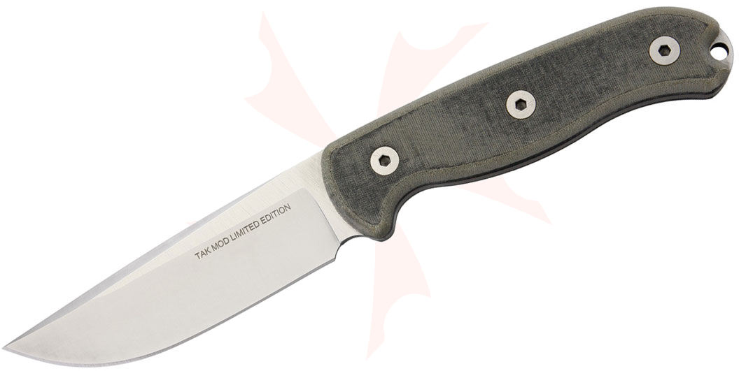 The TAK series has always been known for its extreme durability. This fixed blade features a 154CM steel blade, canvas Micarta handles, and a MOLLE compatible sheath. The Micarta handle slabs offer increased grip when wet and feature an extended pommel with lanyard hole. The handle slabs are attached to the full tang blade with stainless steel screws.