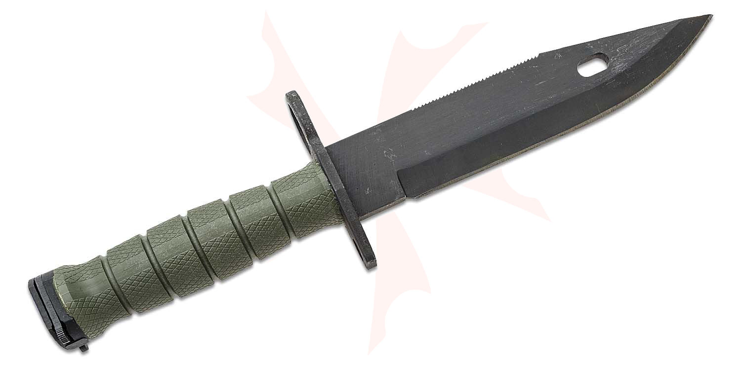 Ontario M-9 Bayonet, Olive Drab Handle and Scabbard Designed to Military specifications for attachment to M16 rifles, this bayonet features a 490 M9 Bayonet & Scabbard | Blackblack coated blade, LBE belt attachment clips with quick release, Hard sheath with strapdown loops and Pivot pin which, with knife, forms emergency wire cutter. Milled sawteeth on back Black oxide protective finish