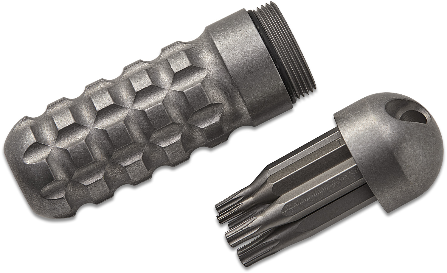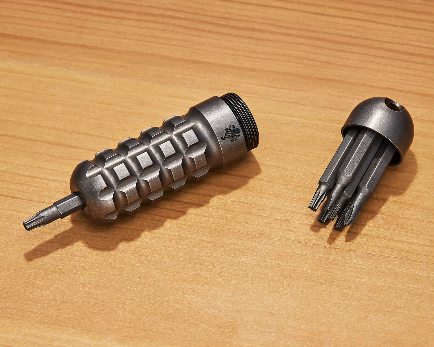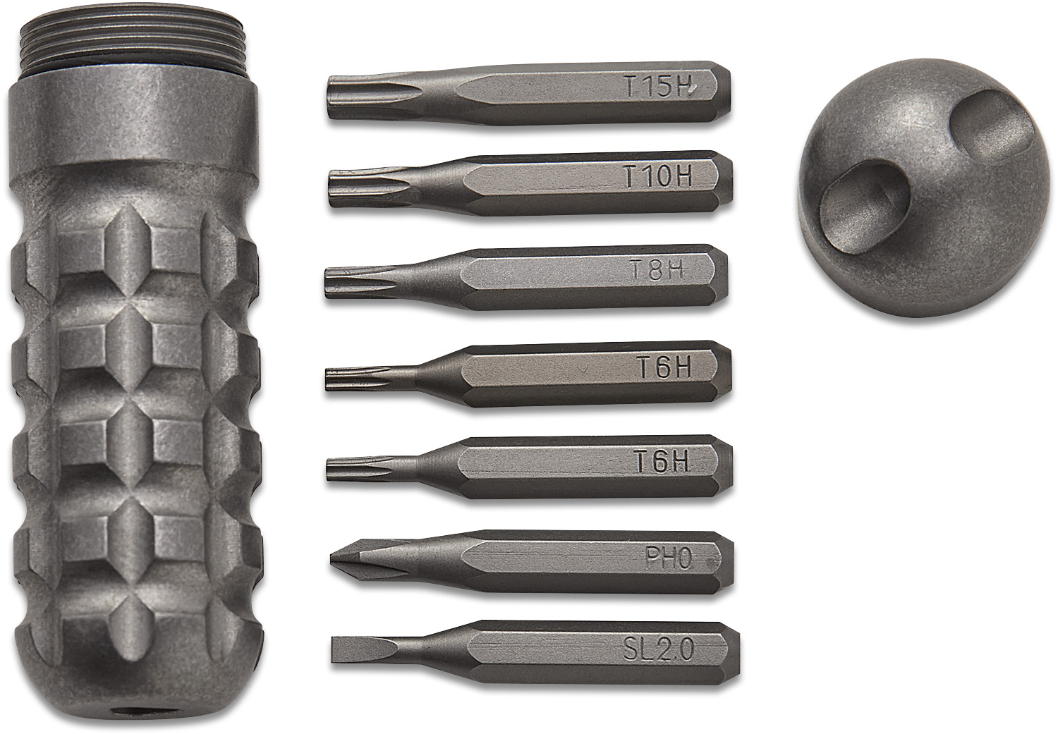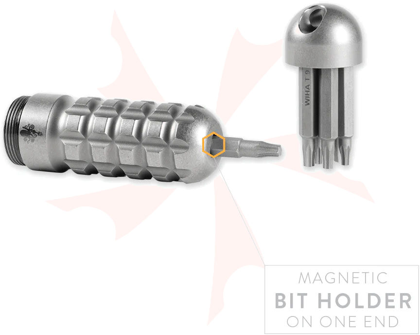 The SPD KnifeTool XS includes high-quality Wiha 4mm Micro driver bits; T6, 7, 8, 9, 10, and a flathead and Phillips. Each bit can be inserted on one end and held by a strong rare earth magnet. The other end is a cap that secures all 7 bits while not in use. One of our favorite small-batch custom tools we've come across.