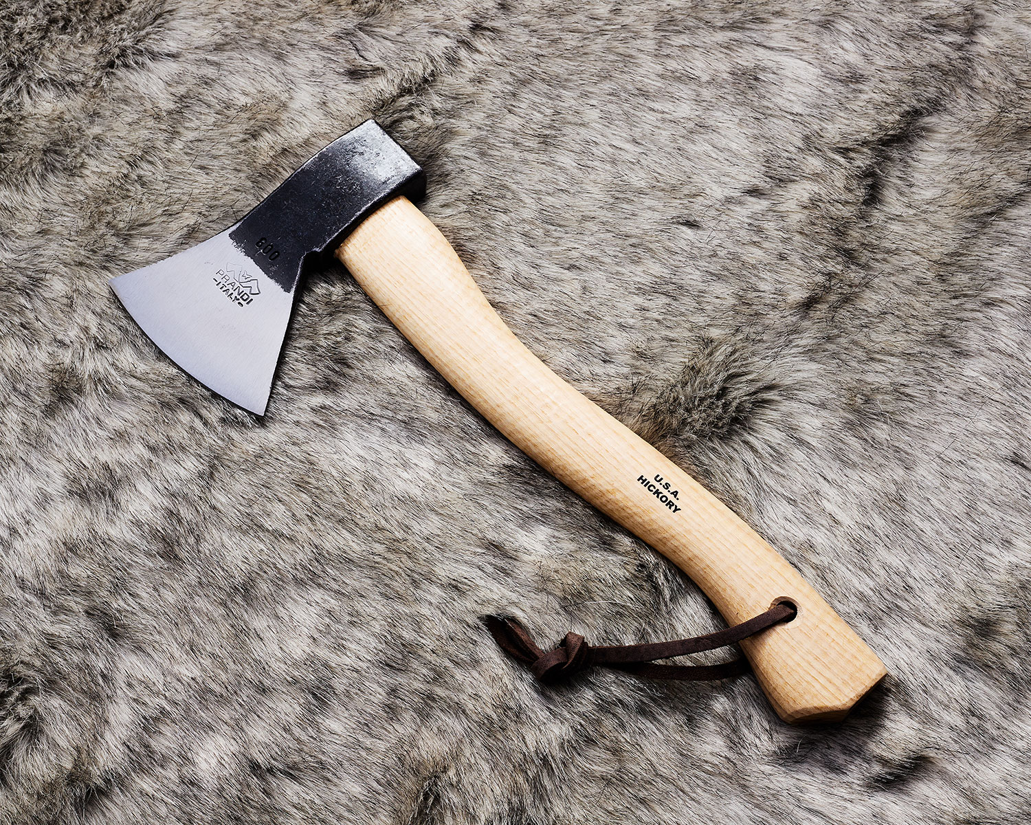 The Prandi Vintage Line includes high-quality cutting and splitting tools. Among the tools are axes, hatchets, wedges, woodcutting tools with high carbon steel inspired by traditional cutting and splitting tools from Scandinavia. The blades are accurately tempered with oil and later placed under further tempering treatment, hardening at a density between 47 and 55 HRC. The taping of the blade, made by hand with grained flap wheels, favors the movement of the blade through wood, reducing the amount of surface friction and increasing the efficacy of the cut. The sharpening, also completed by hand, guarantees a better performance of cutting of any type of wood, even more knotty woods. The German Style Hatchet measures in at 15" overall with a 4.25" cutting edge and 6.5" carbon steel axe head. The handle is made from American Hickory wood and includes a leather lanyard. Bulk packed.