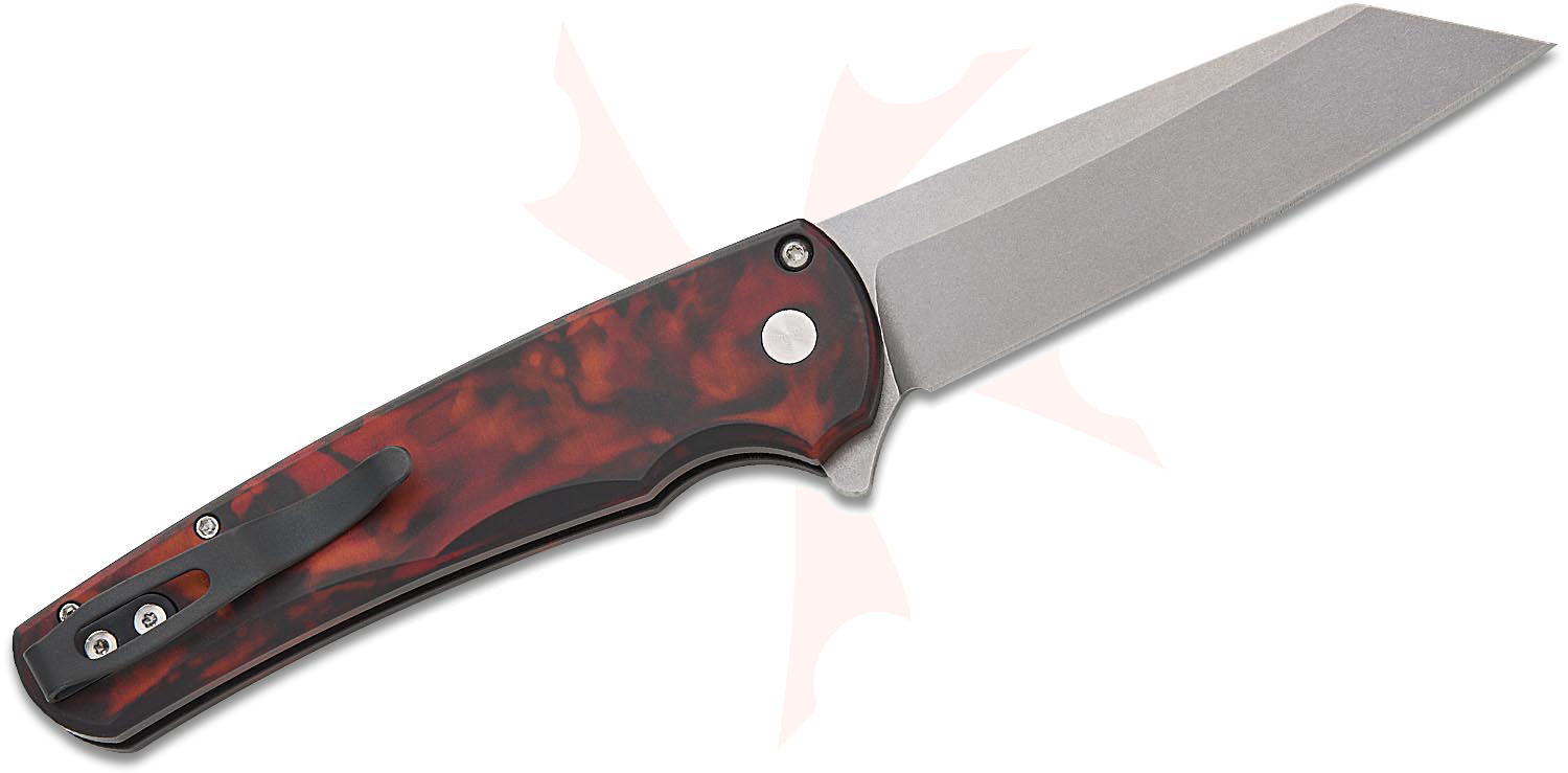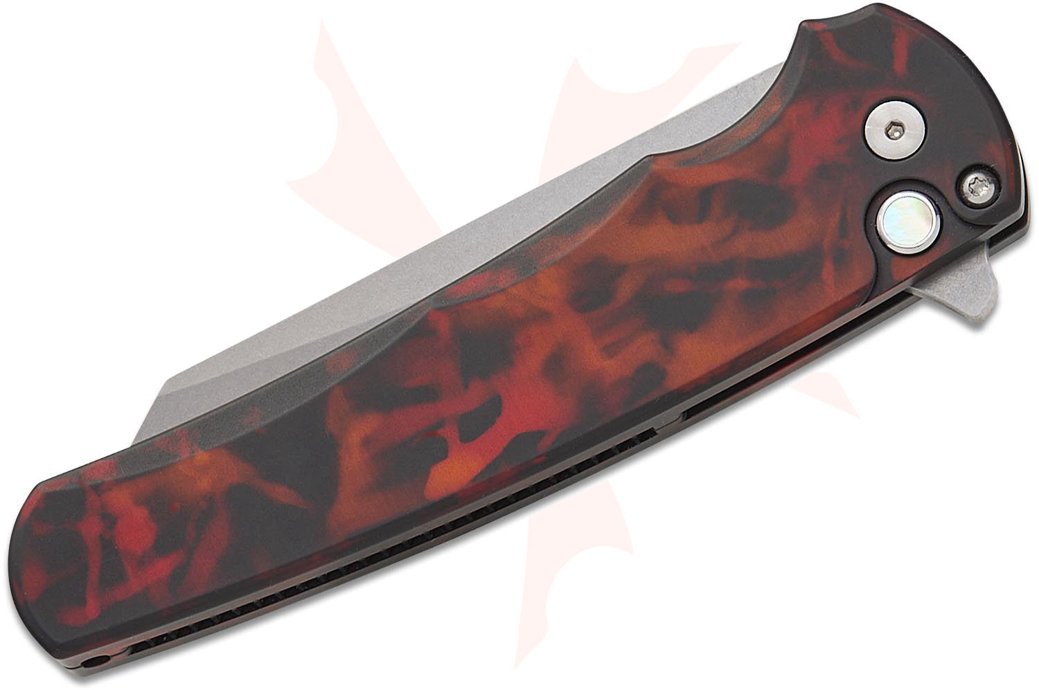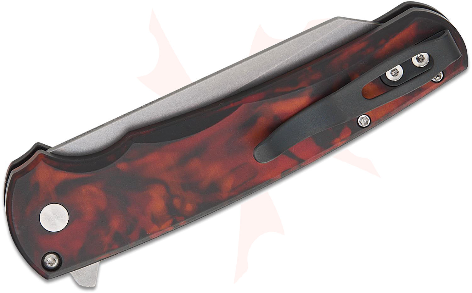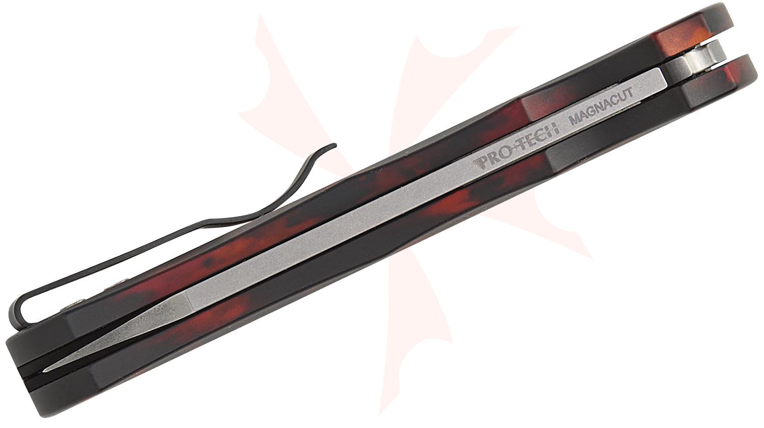 Pro-Tech 5401 Malibu Button Lock Manual Flipper Knife 3.3" CPM-MagnaCut Stonewashed Reverse Tanto Blade, Custom Anodize "Del Fuego" Aluminum Handles, Black Lip Pearl Button - 5401-DF
