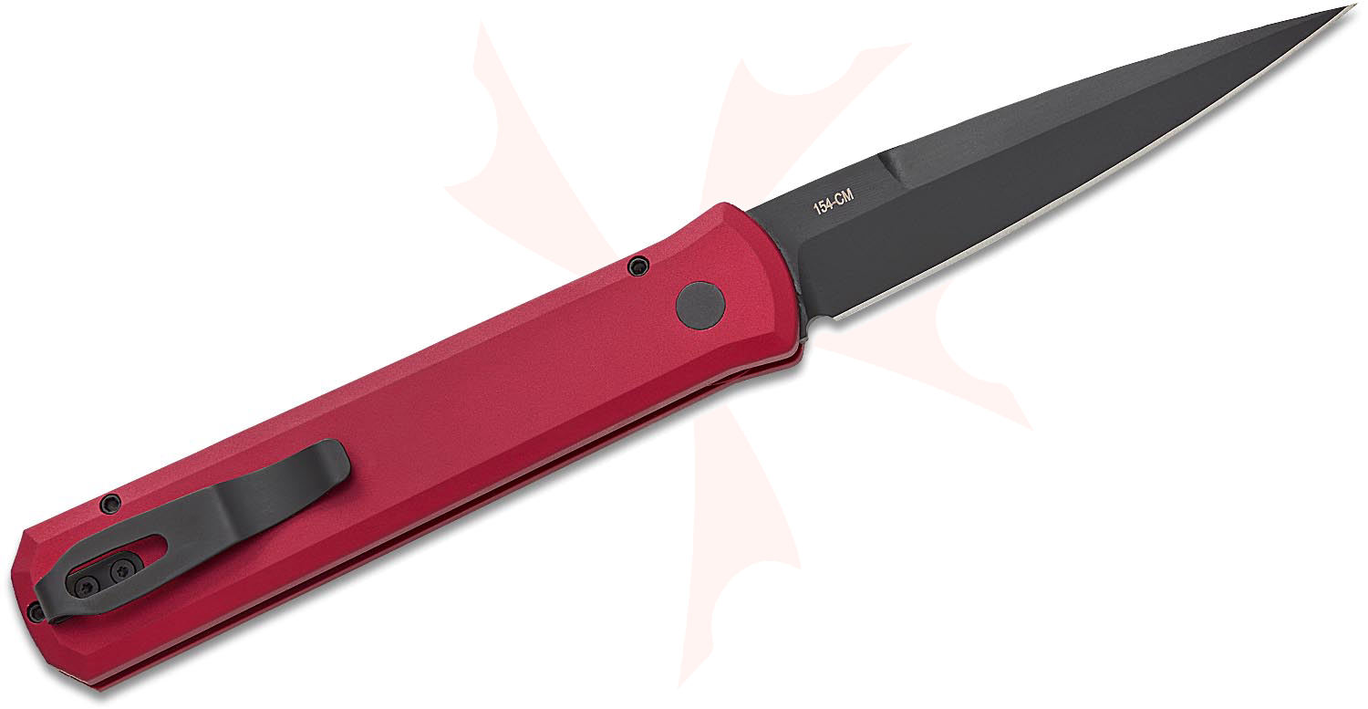 Pro-Tech Knives is proud to be the first choice of Police and Military professionals around the world. Pro-Tech Knives are built to serve and serve well. This awesome 4" blade AUTO knife represents the influence of the original Italian "Stiletto" style AUTO knife and Pro-Tech's modern coil spring precision. The Godfather production AUTO knives feature T6-6061 aluminum handles that are machined from solid stock. Production Godfather blades are four inches in length and made from 154CM stainless steel that is heat-treated to 59HRC. There are many different handle colors, blade finishes, and inlay materials available. This model features a red anodized aluminum handle and a black DLC blade. No matter which Godfather variation you choose, you will enjoy its combination of unequaled style and quality.