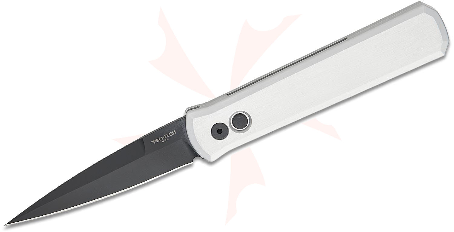 Pro-Tech Knives is proud to be the first choice of Police and Military professionals around the world. Pro-Tech Knives are built to serve and serve well. This awesome 4" blade AUTO knife represents the influence of the original Italian "Stiletto" style AUTO knife and Pro-Tech's modern coil spring precision. The Godfather production AUTO knives feature T6-6061 aluminum handles that are machined from solid stock. Production Godfather blades are 4 inches long and made from 154CM stainless steel, heat-treated to 59 HRC. There are many different handle colors, blade finishes, and inlay materials available. This model features a silver anodized aluminum handle and a black DLC blade. No matter which Godfather variation you choose, you will enjoy its combination of unequaled style and quality.
