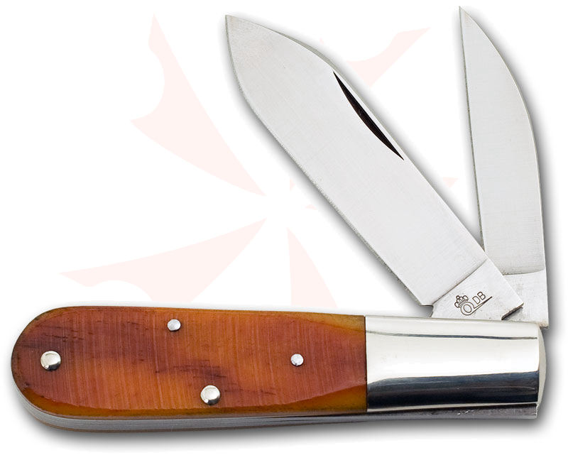 The Small Barlow knife is from Queen's Dan Burke collection has a large spear point blade and a smaller sheepsfoot blade. The amber colored bone handle gives it an antique look, lending an elegance to the high quality blade. The primary spear point blade is great for general use, and the smaller sheepsfoot blade is perfect for slicing, making this a knife for all occasions.