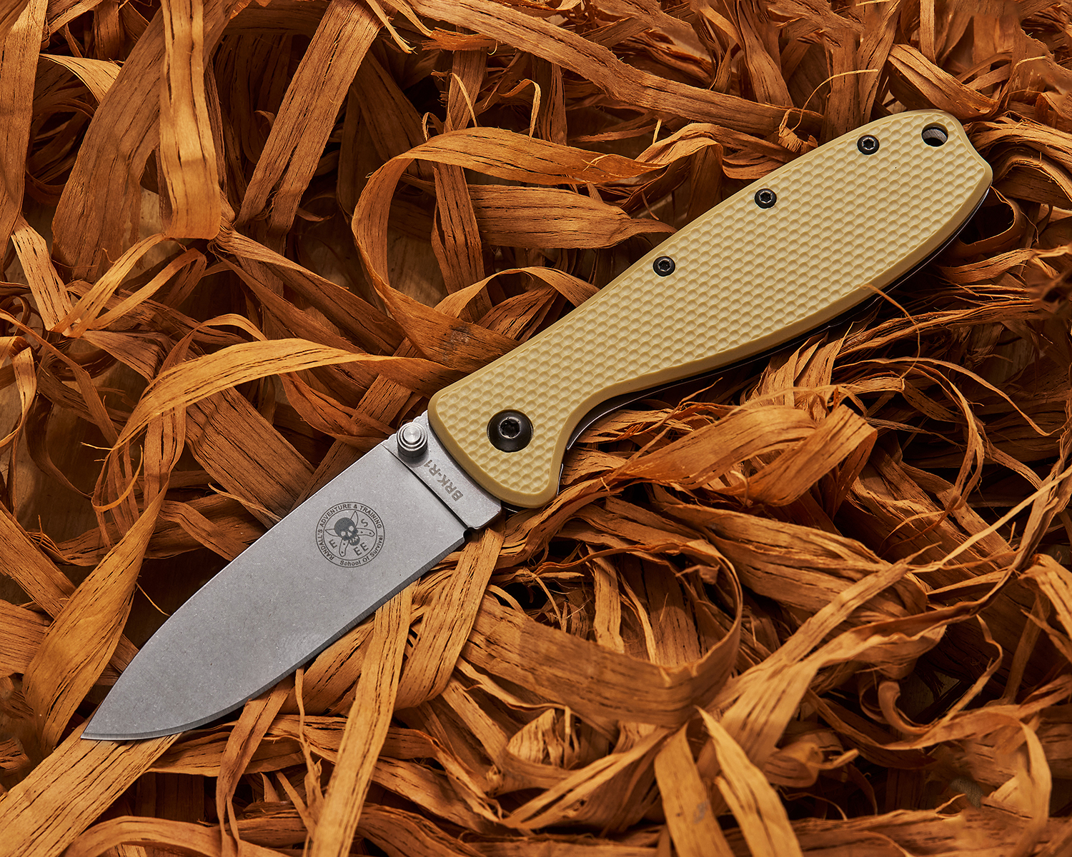 Zancudo Folding Knife 3" Stonewashed Blade, Desert Tan FRN and Stainless Steel Handles, Designed by ESEE, Frame Lock - BRKR1DT