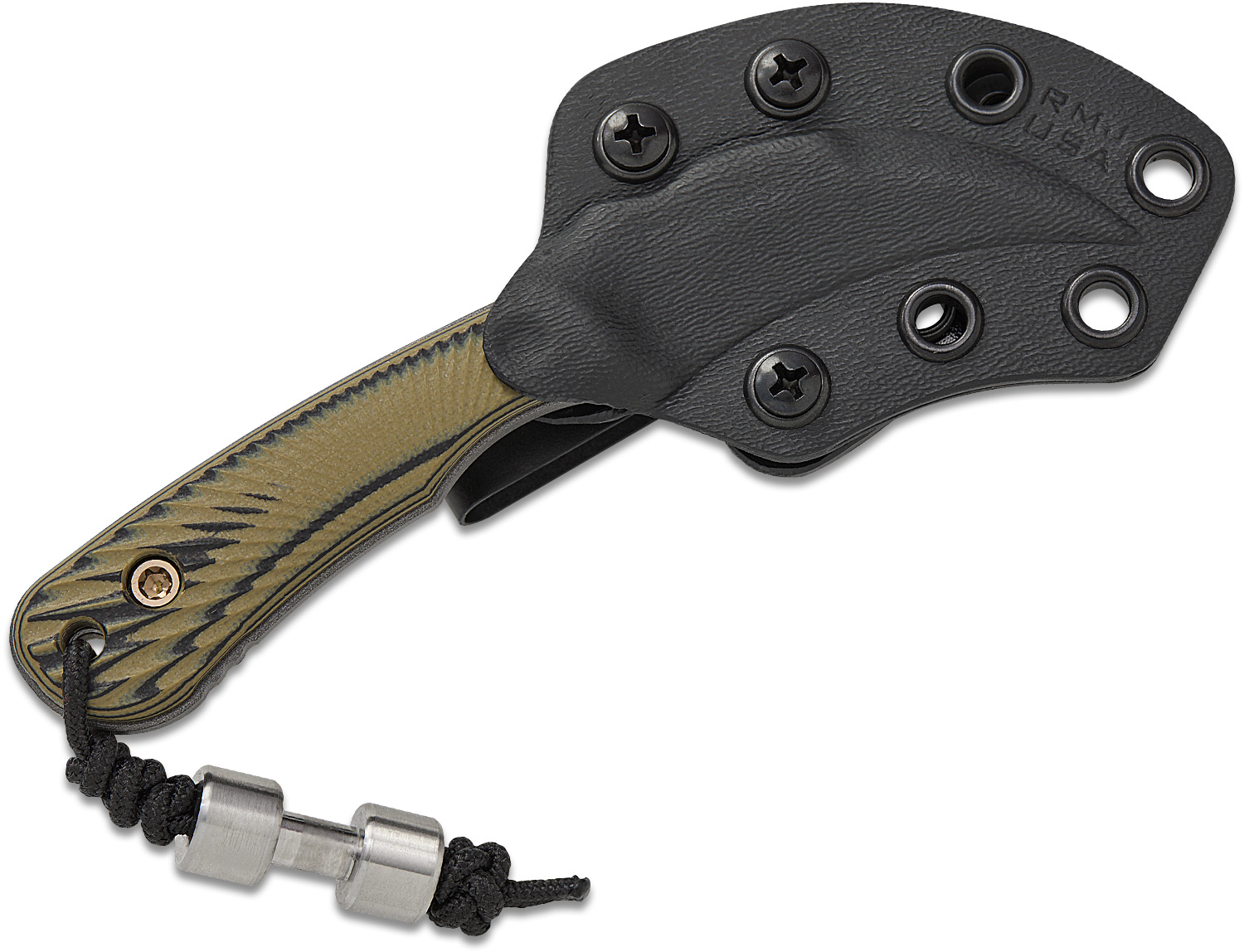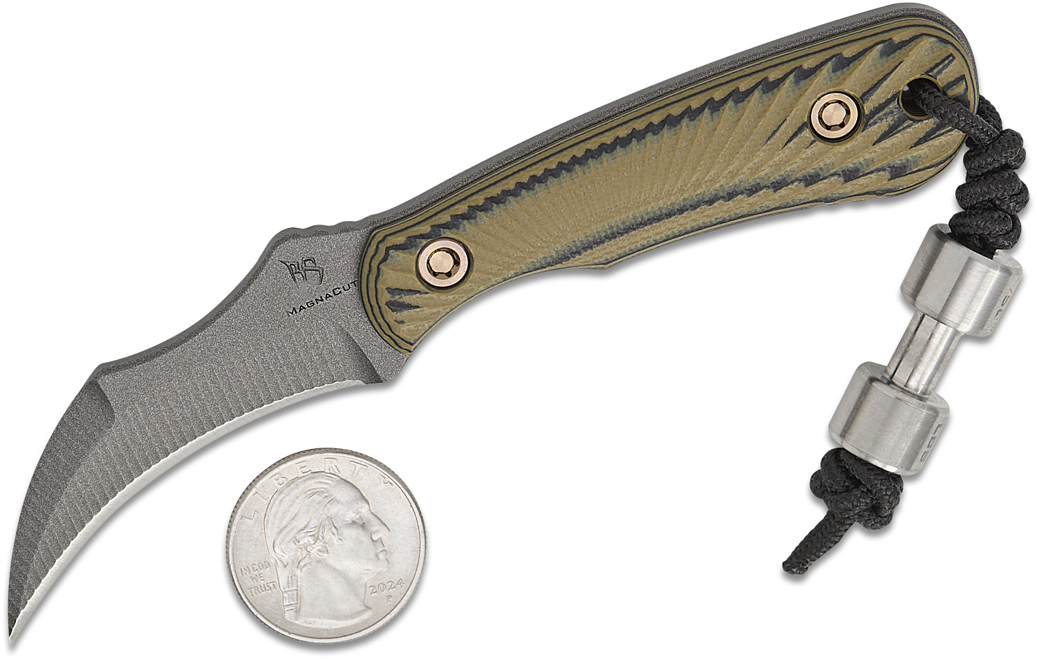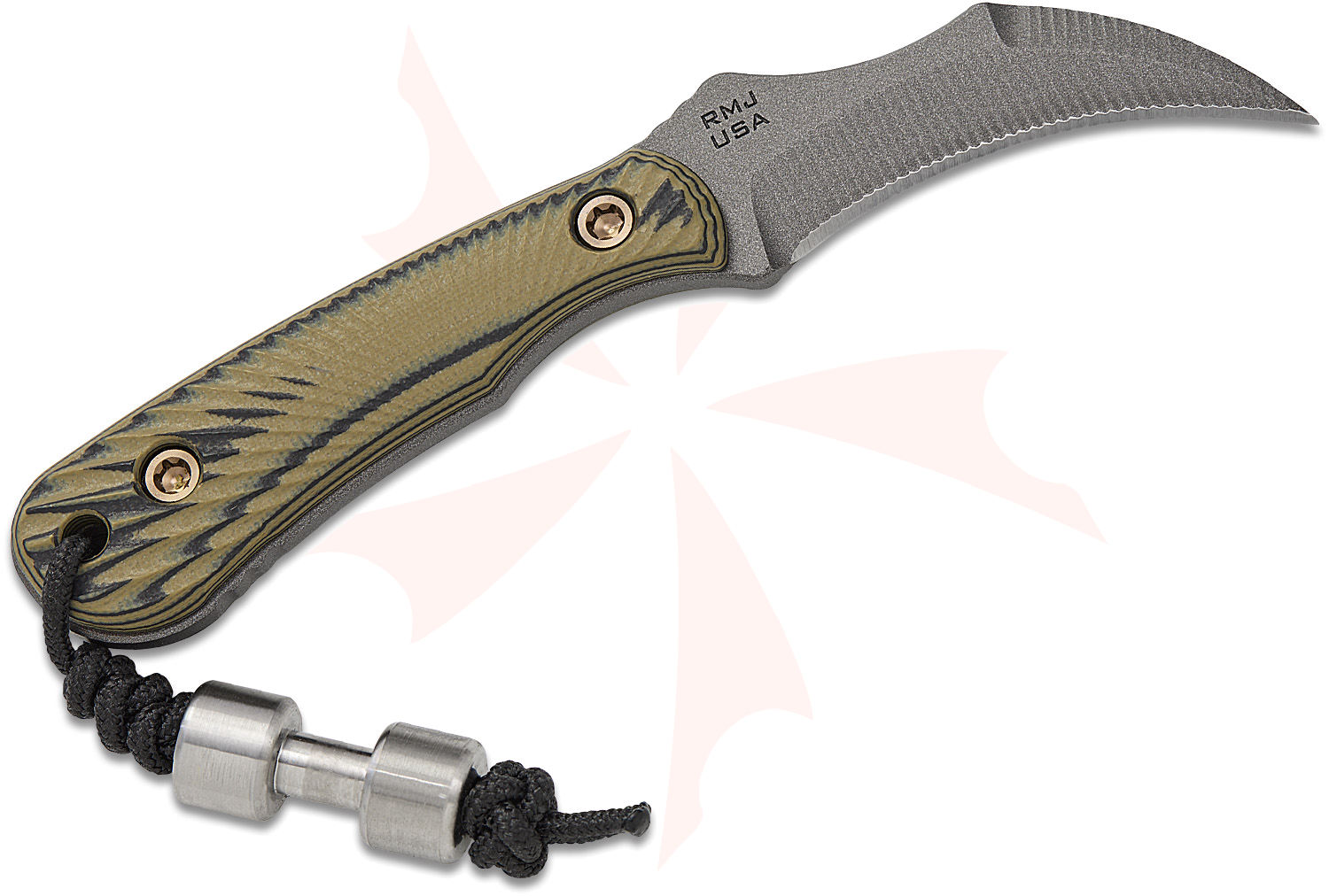 RMJ Tactical Gym Rat Pocket Fixed Blade Neck Knife 2.375" MagnaCut Tungsten Talon Hawkbill Blade, Dirty Olive G10 Handles, Kydex Sheath - [K-GR-MC-TU-DO]