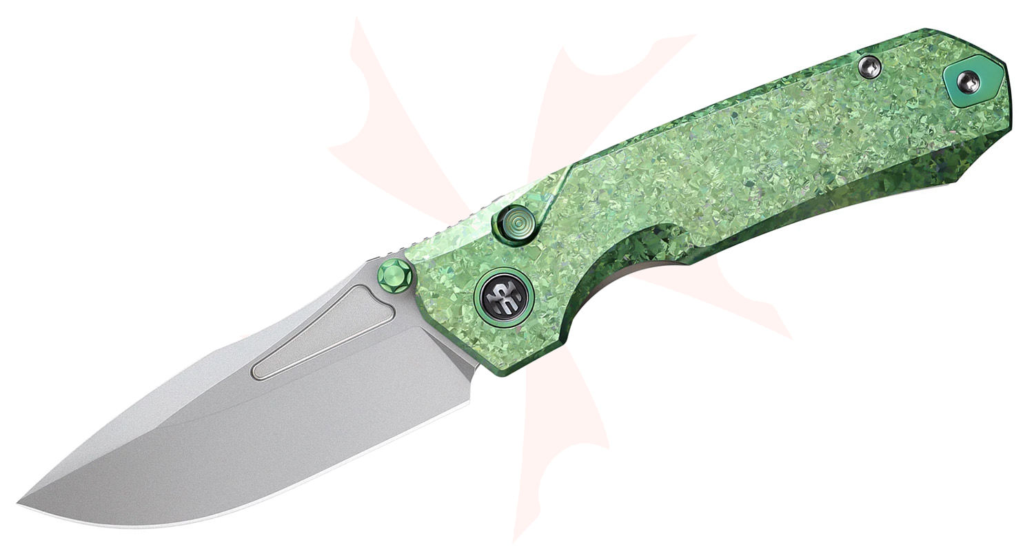 Remette Knives Rhino Button Lock Front Flipper Knife 3.07" M390 Pearlescent Drop Point Blade, Green Crystallized Titanium Handles - RNTB4