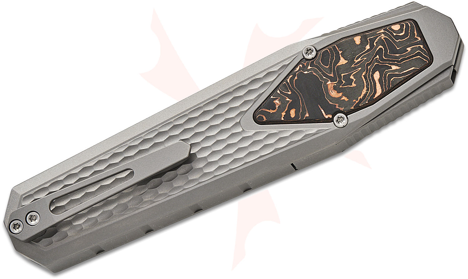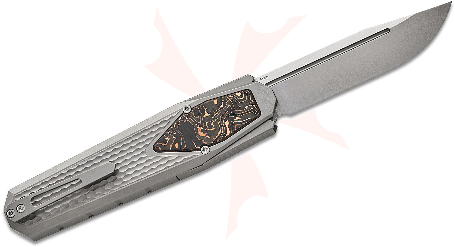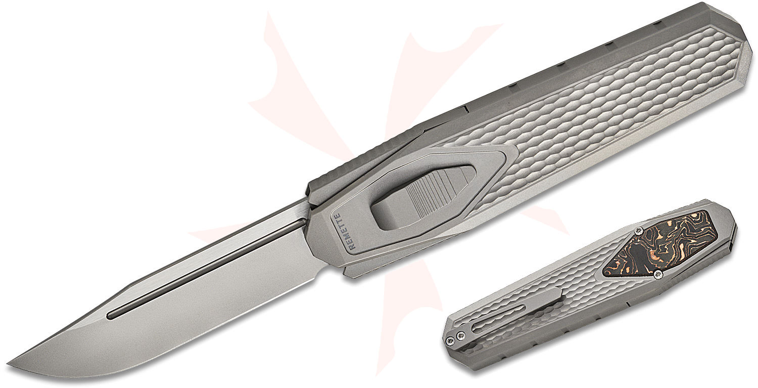 Remette Knives RT-Swordfish OTF Gravity Knife 3.03" M390 Clip Point Blade, Sand Blasted Titanium Handles with Copper Carbon Fiber Inlay, Leather Pouch, Slide Lock - ZL101A4