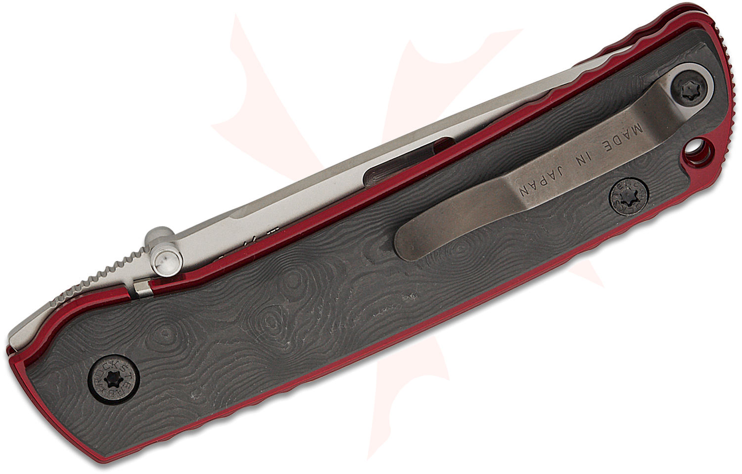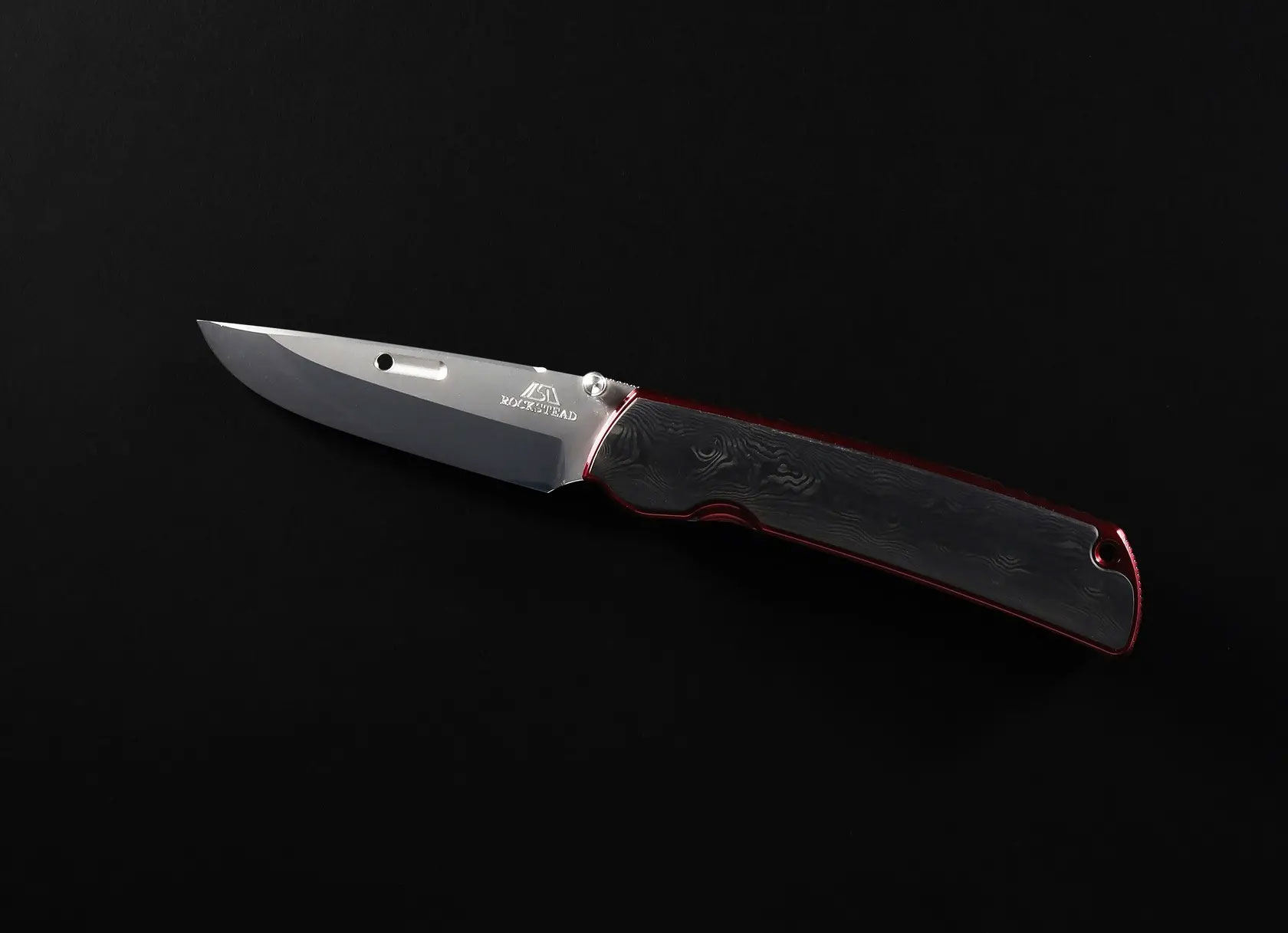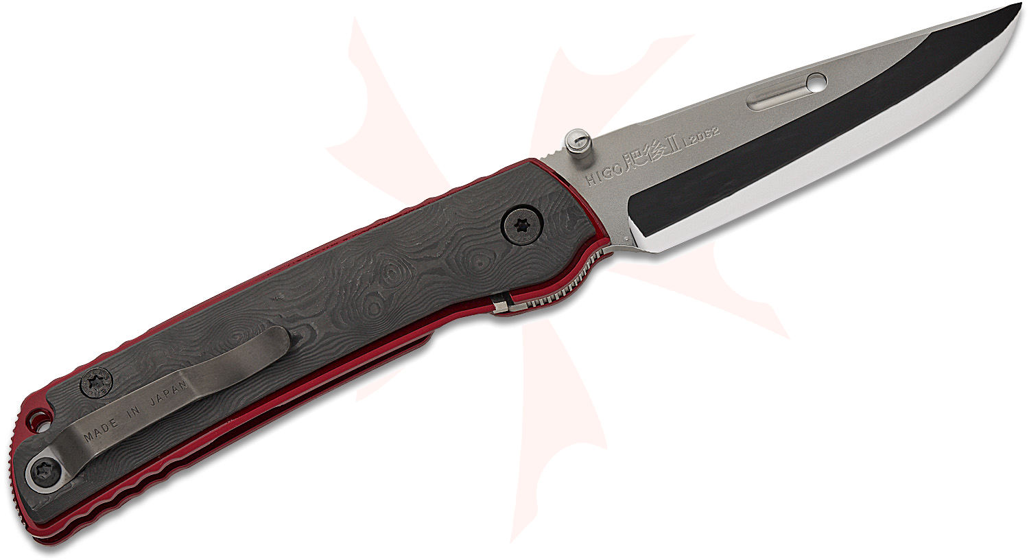 Rockstead HIGO II X-FCF-ZDP (BDR) Japanese Folding Knife 3.5" ZDP-189/VG10 Clad Mirror Finish Blade, Black Dunes FatCarbon Handles with Red Titanium Liners, Liner Lock