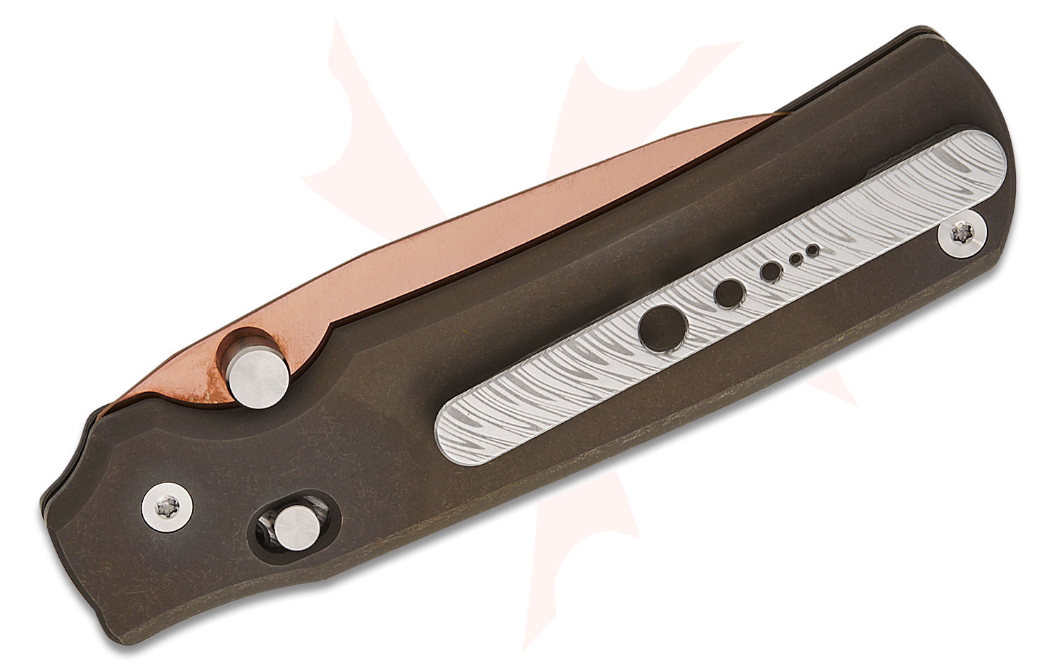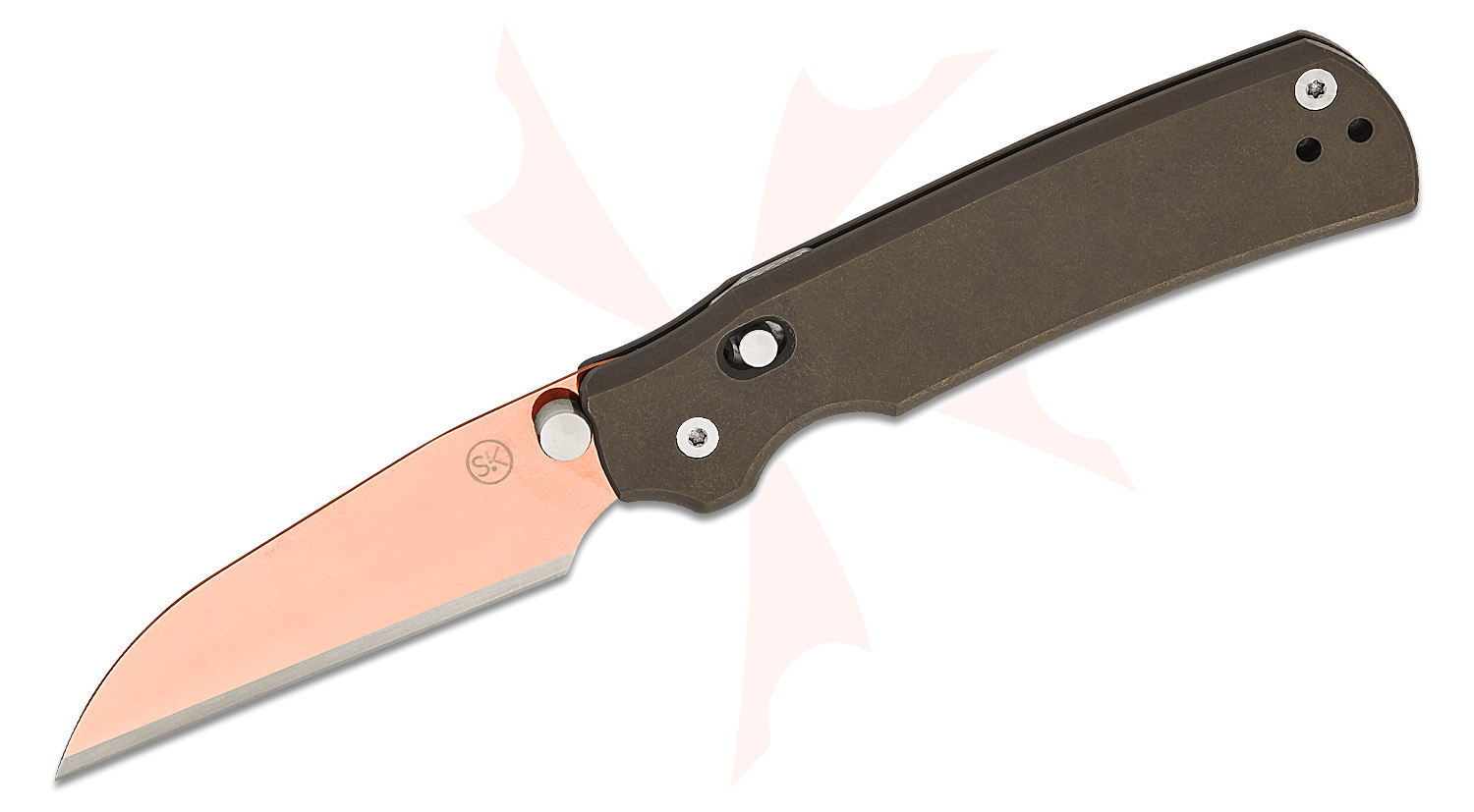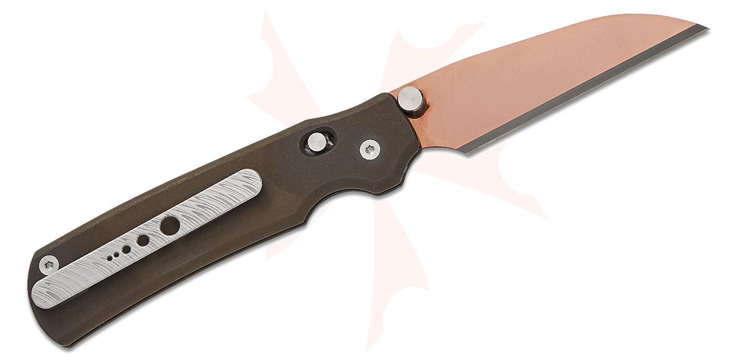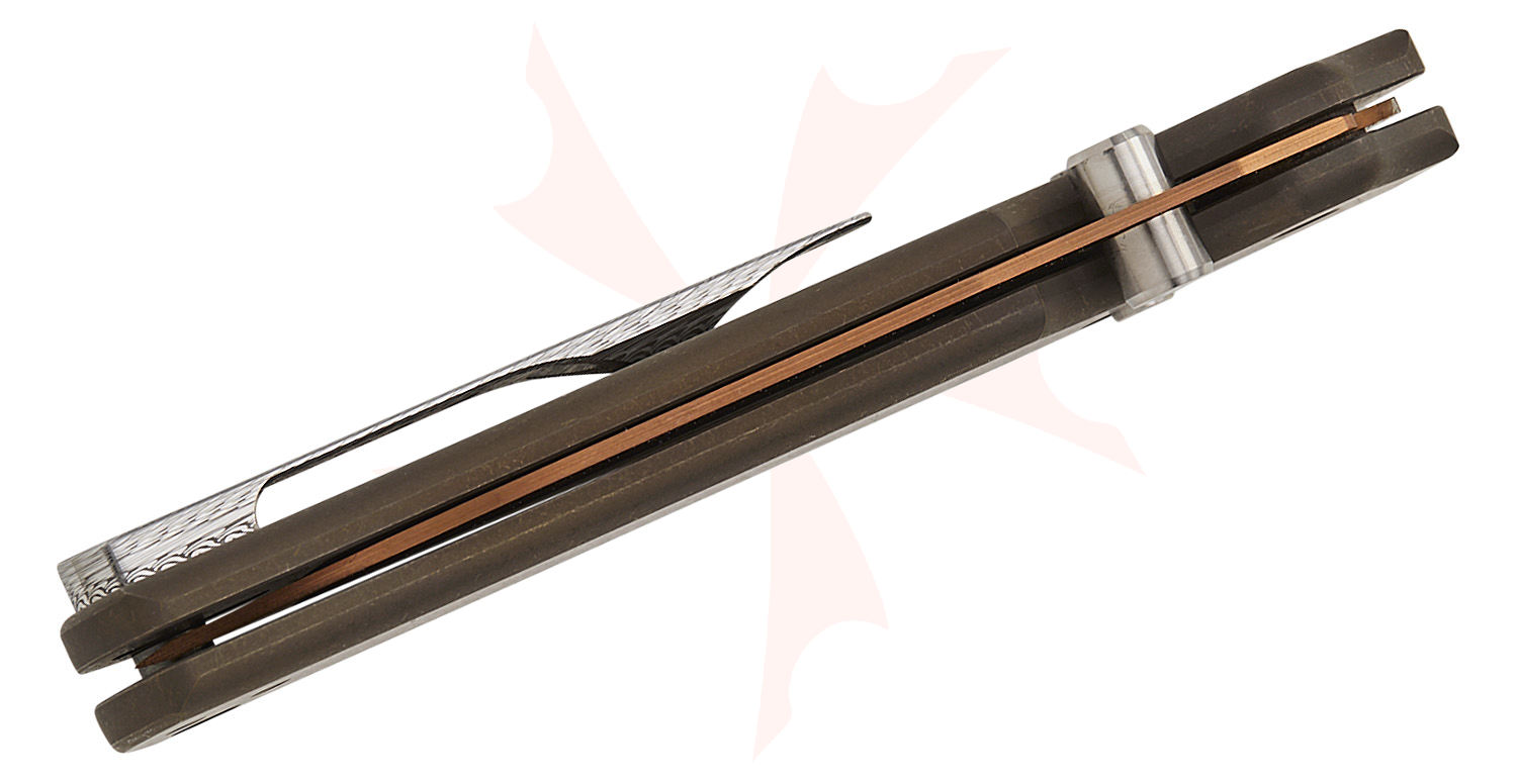 Sandrin Knives Roma Crossbar Lock Folding Knife 3.14" Polyhedral Tungsten Carbide Polished Bronze PVD Wharncliffe Blade, Dark Bronze Contoured Titanium Handles, Reversible Damascus Clip