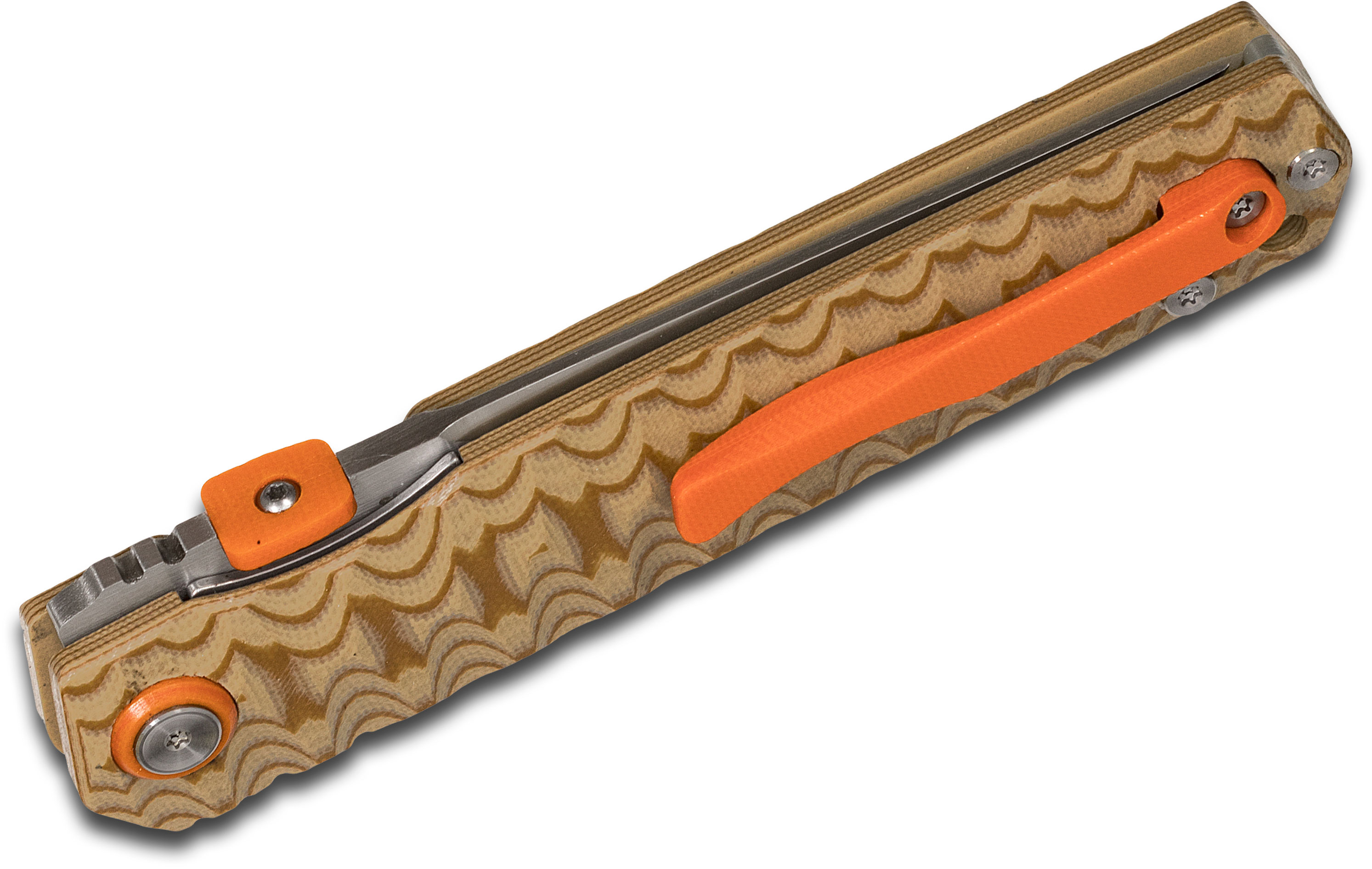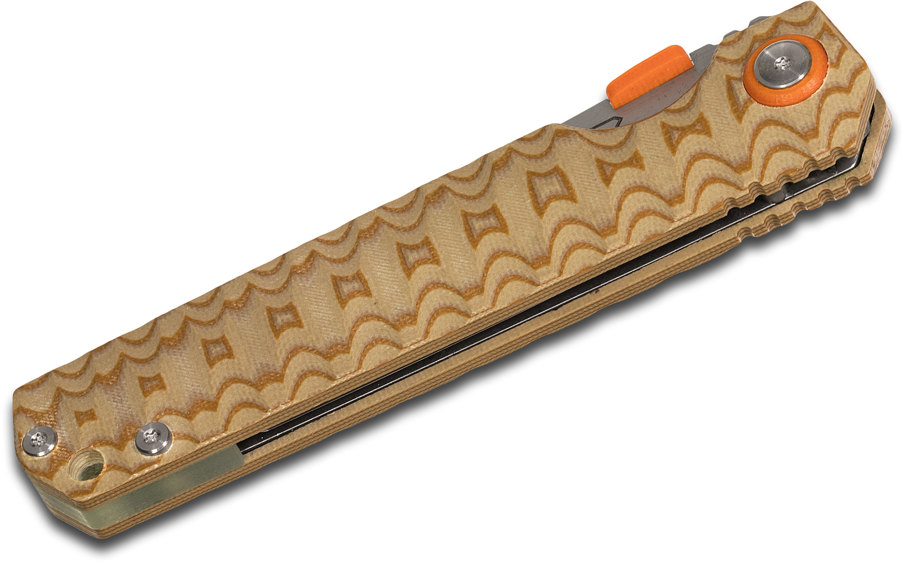 - Handle Material: Tiger Stripe G10, Concave/Convex Milling