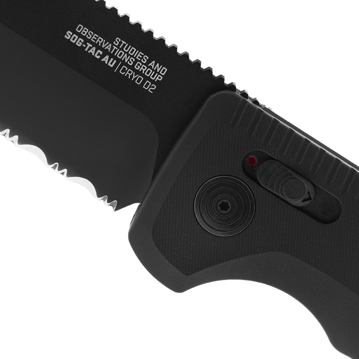 Designed as a go-to for professional and defensive carry users, the SOG-TAC AU is an automatic folding knife that incorporates SOG's XR lock into a unique opening mechanism. Fully ambidextrous, the SOG-TAC's AU-XR lock is both easy to open and lock up, with a double-action safety that moves with a simple push of a finger. Featuring a 3.43" CRYO D2 tool steel blade and a hard-anodized aluminum handle, the SOG-TAC AU is a knife for those who demand reliability.