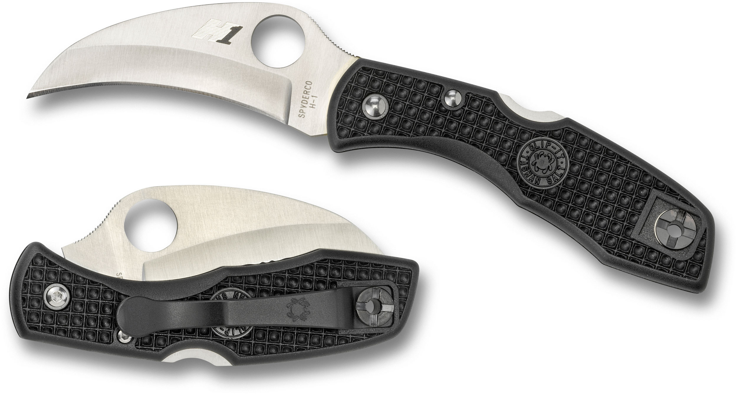 The Tasman Salt folder features a Hawkbill blade. This distinctive curved cutting tool has a claw-like tip that originated in the marine/commercial fishing industry. Cutting in and around water involves cutting line, netting and rope and it’s done quickly, often at arm’s length while pulling downward or toward you. The blade’s arcing tip holds what you’re cutting against the sharpened edge keeping it from slipping off the tip. Spyderco’s rustproof Hawkbill blade is made with state of the art non-rusting H-1 steel. H-1 is a precipitation-hardened steel containing nitrogen instead of carbon, which cannot rust. The plain edge hollow-ground blade offers remarkable cutting performance in and around fresh and saltwater. The black fiberglass reinforced nylon (FRN) handle is textured with a Volcano Grip pattern. It’s equipped with a reversible left/right hand titanium pocket clip (also non-rusting) that positions the folder tip-up in the pocket. We recommend threading a thong or cord through the lanyard hole for back-up retention around water, where once dropped, a knife is often lost or irretrievable.
