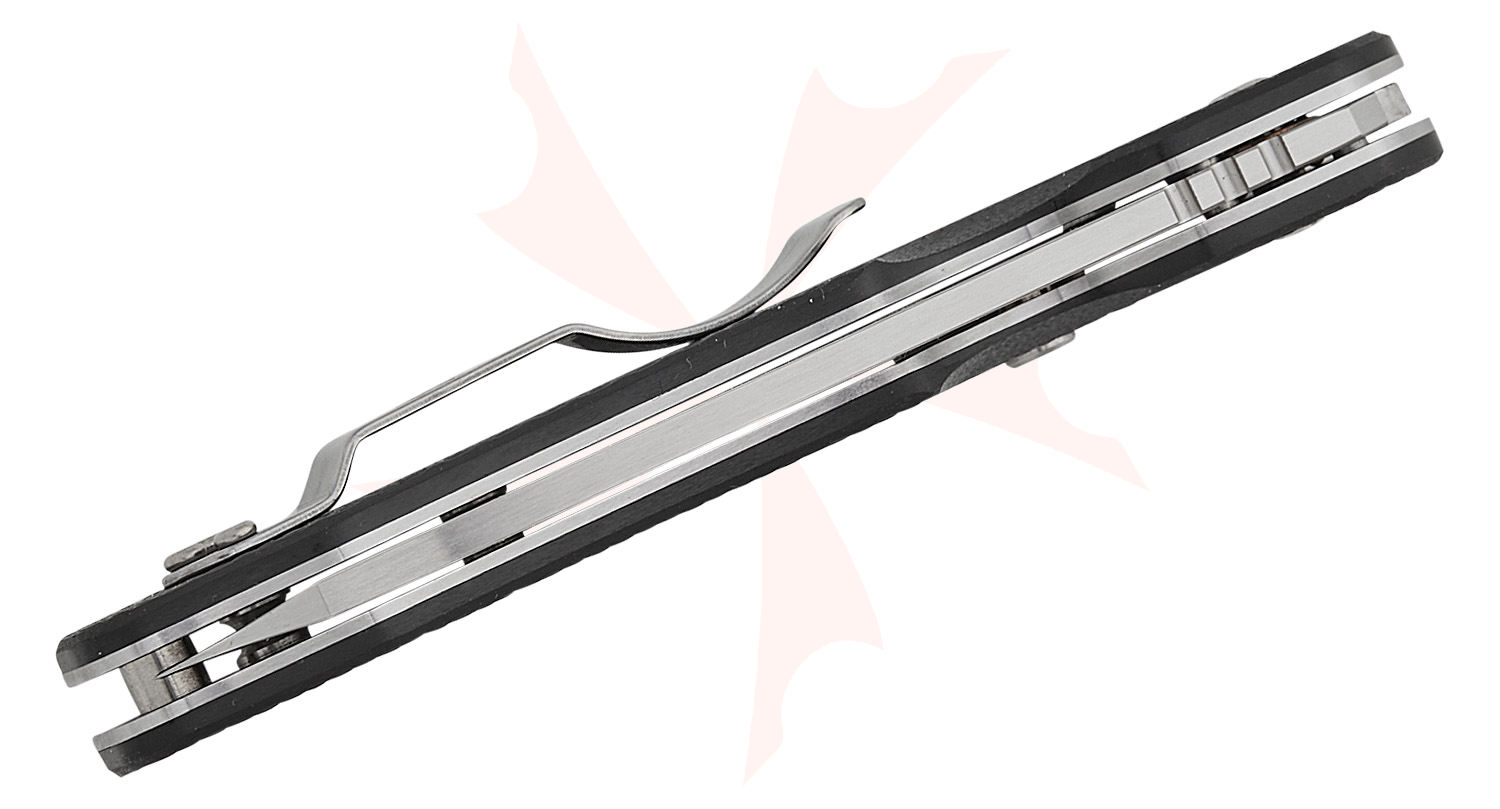 The Smock's handle is built on a framework of full, skeletonized stainless steel liners that also form the basis of the knife's stout Compression Lock mechanism. They are capped by textured carbon fiber/G10 laminate scales with matching skeletonizing holes that further reduce weight and contribute to the knife's unique style. Instead of the traditional lock release on the spine of the handle, the Smock's Compression Lock is complemented by a button nested in the obverse (near-side) scale. Pressing the button releases the lock and allows the blade to be easily closed with only one hand without ever placing your fingers in the path of the edge. The handle's open-backed design further minimizes the knife's weight and simplifies cleaning, while its lined lanyard hole and reversible tip-up hourglass clip provide convenient ambidextrous carry.