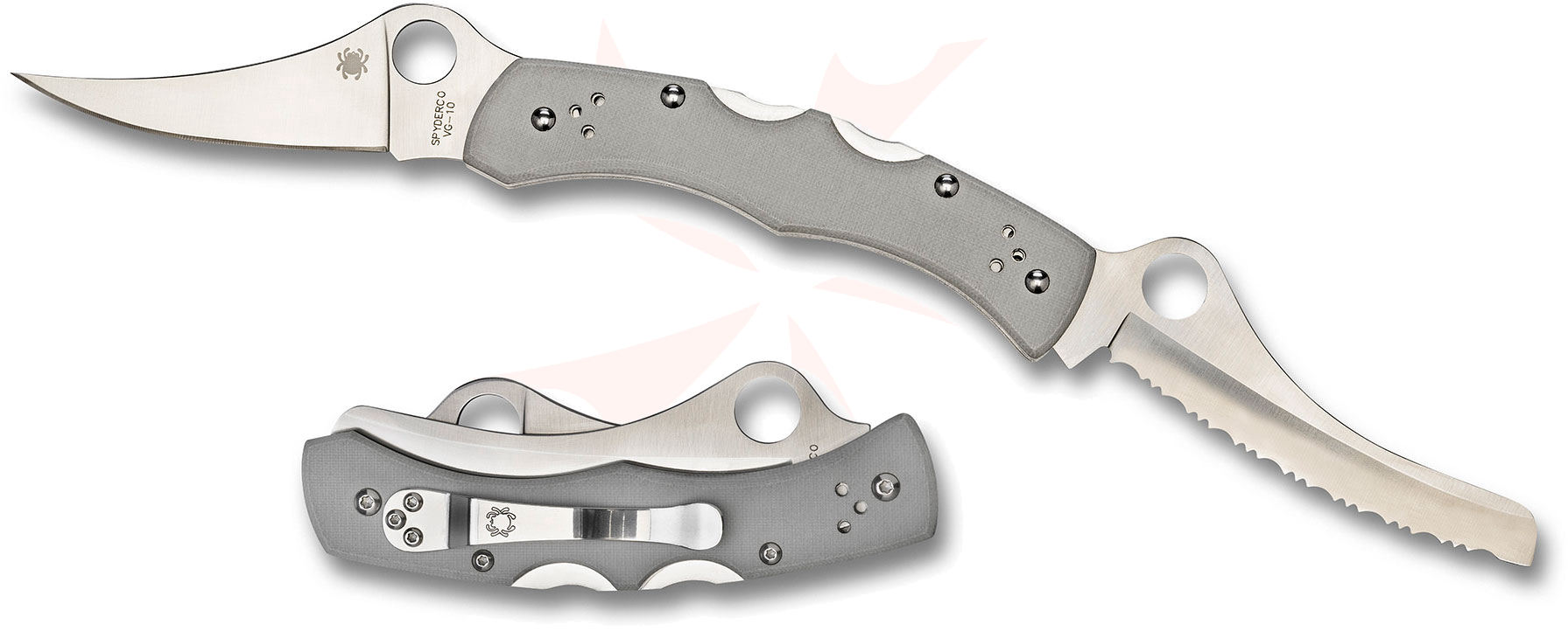 The Dyad revolutionized the concept of the traditional twin-blade pocketknife by adding the advantages of one-handed opening, convenient clip carry, reliable patented by-pass lock mechanisms, and both the cutting power of a serrated edge and the finesse of a plain edge. This pocket powerhouse is back in limited quantities as a Sprint run, featuring textured gray G-10 scales and an all-new four-position hourglass clip. Its VG-10 stainless steel blades include a SpyderEdge sheepfoot profile and a full-flat-ground plain edge clip-point, giving you the power and versatility to tackle virtually any cutting chore.