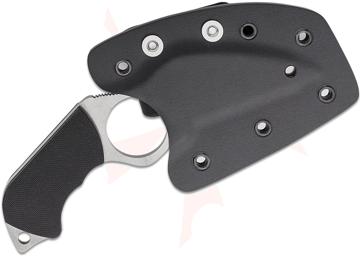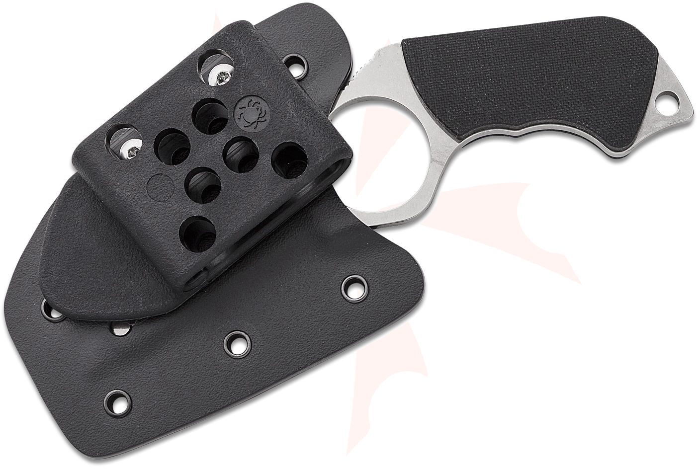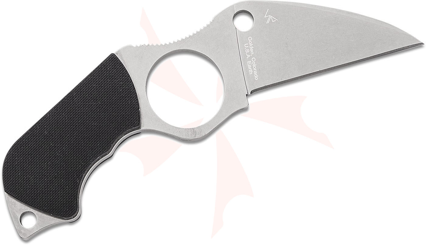 Designed by Spyderco founder Sal Glesser and inspired by the groundbreaking innovations of French knifemaker Fred Perrin, the Swick is a purpose-designed personal-defense tool. Its most distinctive feature is a Perrin-inspired index-finger hole that locks the knife into the user's hand for superior grip security. Sized for a man's hand, the 1.03-inch-diameter (26.1 mm) hole is flanked by a full-flat-ground Wharncliffe blade and a full-tang, pistol grip-style handle. Concealed internal pins secure a pair of peel-ply-textured scales to the handle, and a strategically placed section of jimping (textured grooves) on the spine provides a non-slip thumb ramp. Made from ultra corrosion-resistant LC200N, the Swick is accompanied by a custom-molded Boltaron sheath with a fully adjustable G-Clip and breakaway ball chain to offer a full spectrum of carry options.