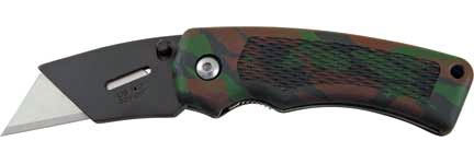 Superknife SK Edge Camo Rubberized Handles. 3 3/4" closed folding utility knife. Holds standard and contractor grade utility blades. Easy press and release blade removal. Spring lock holds blade safe and secure. Camo textured rubberized handles with stainless pocket clip. Made in China.