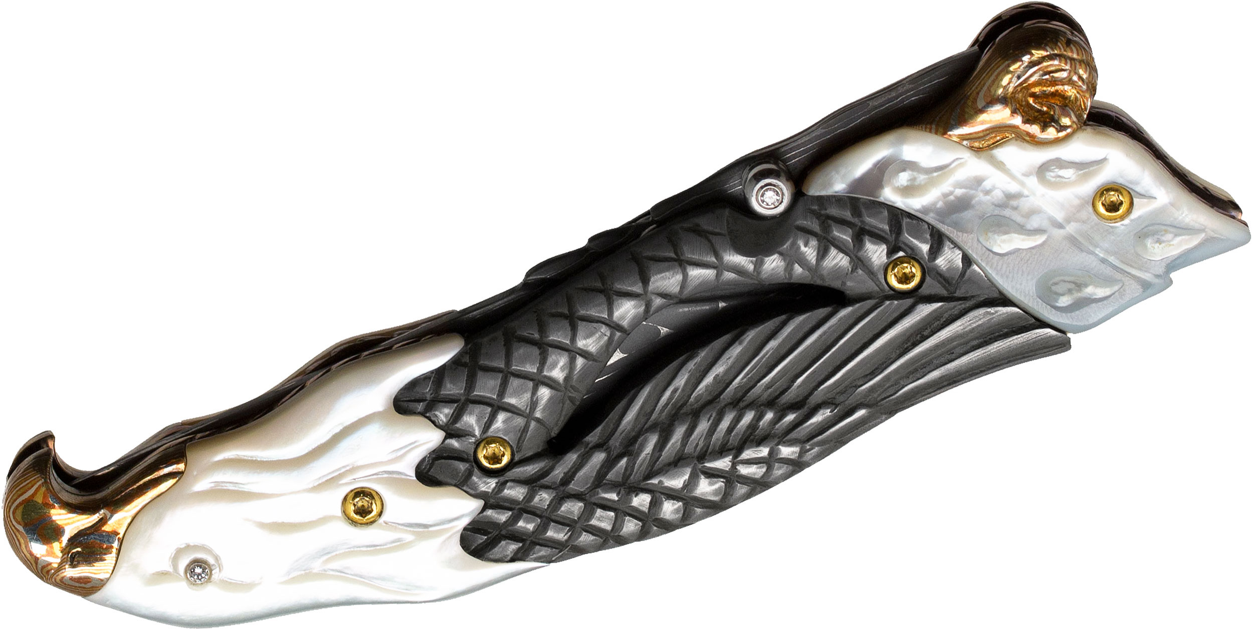 This stunning custom Damascus Eagle folder is ornate, intricate and built with some seriously tight tolerances. The 3.25" Chad Nichols stainless Damascus blade has a single Titanium thumb stud inlaid with a real diamond. There are also diamonds inlaid in the eye of both eagles for a very nice touch. The 6Al4V Titanium liners and back spacer are file worked and heat anodized. The handle are white lip pearl inset with 416 stainless steel that is carved in the shape of an eagle. The bolsters and end caps are polished gold Mokume to symbolize the feet and beak of the eagle. It's absolutely amazing the detail this knife incorporates and how each material flows smoothly into the next. The knife is entirely constructed with gold plated torx screws and the action is nice and smooth. Includes an absolutely stunning wooden display case, rayskin zipper pouch, knife completion date and certificate of authenticity. There truly is nothing like a Suchat custom knife.