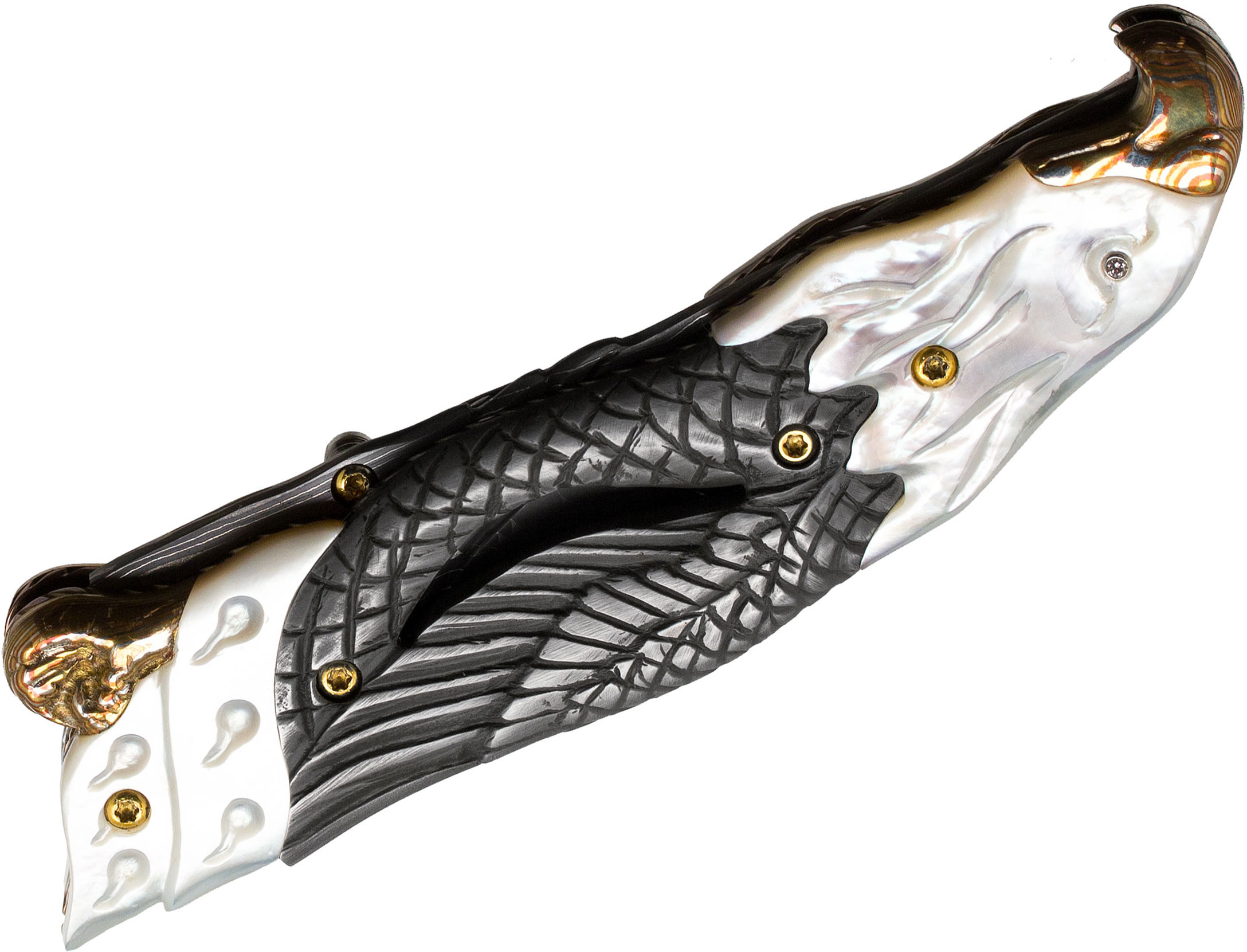 Suchat Custom Knives Eagle Folder 3.25" Chad Nichols Damascus Blade, Carved White Pearl and Stainless Steel Handles with Mokume Bolsters, Liner Lock