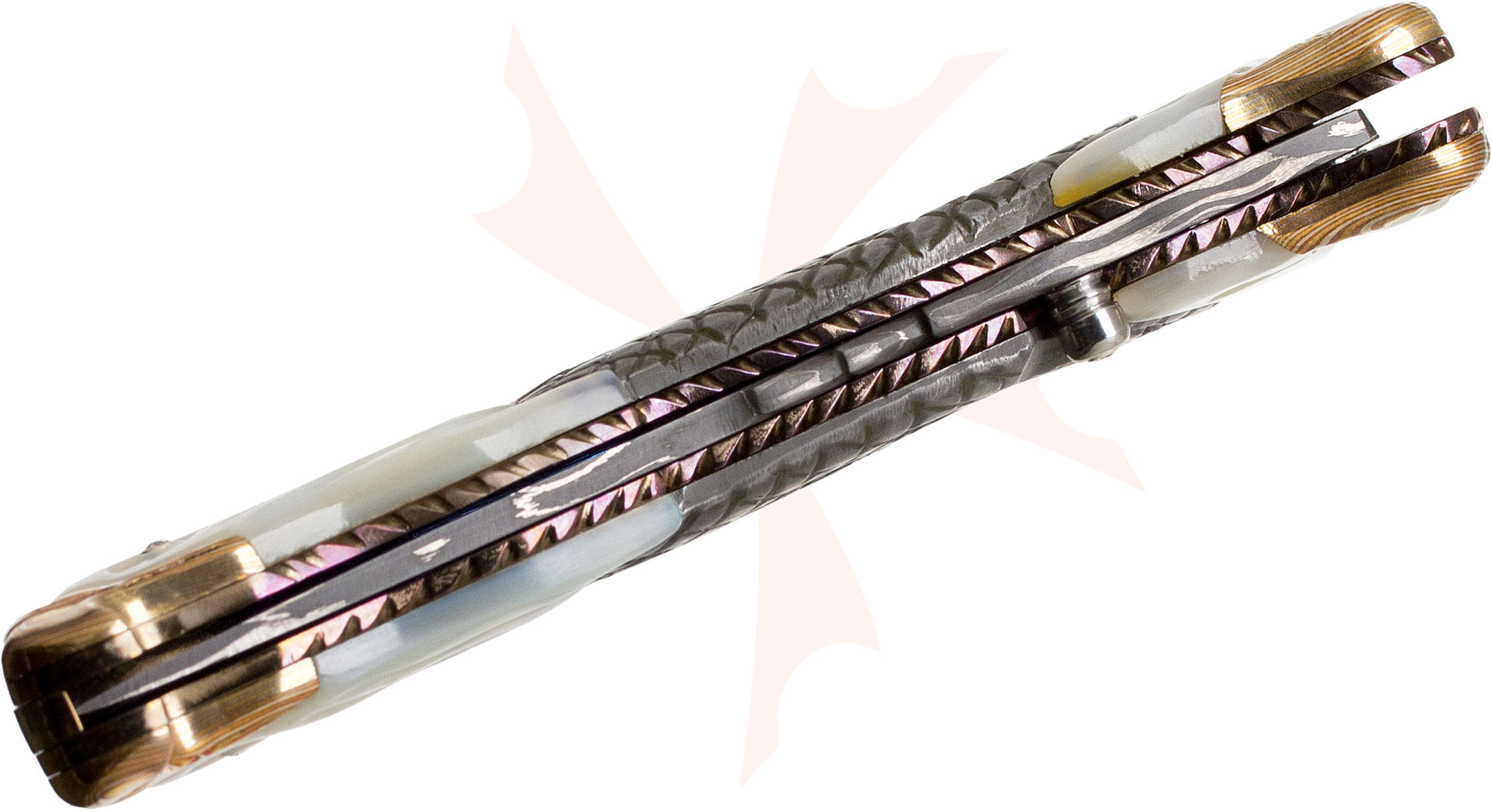 - Handle Material: White Lip Mother of Pearl inset with Carved 416 Stainless Steel and Dual Mokume Bolsters