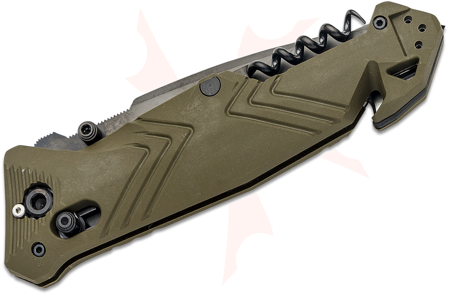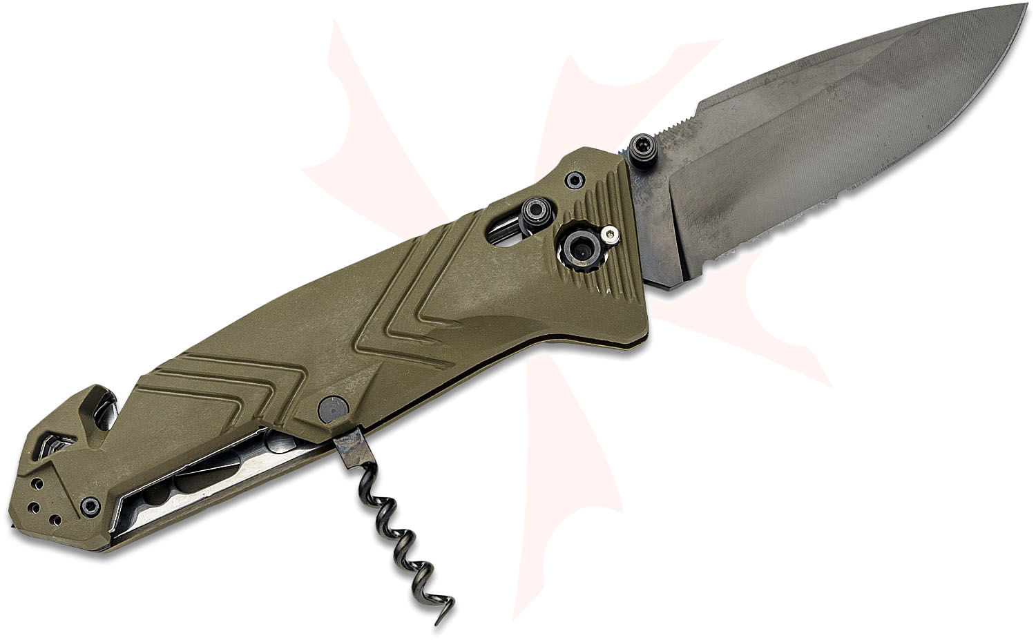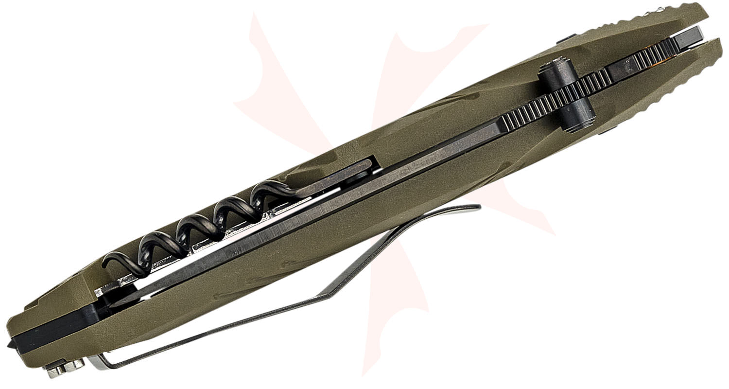TB Outdoor CAC French Army Folding Knife, 3.62" Nitrox Black PVD Combo Drop Point Blade, OD Green PA6 Polymer Handles w/ Corkscrew, AXIS/Crossbar Lock - 11060049